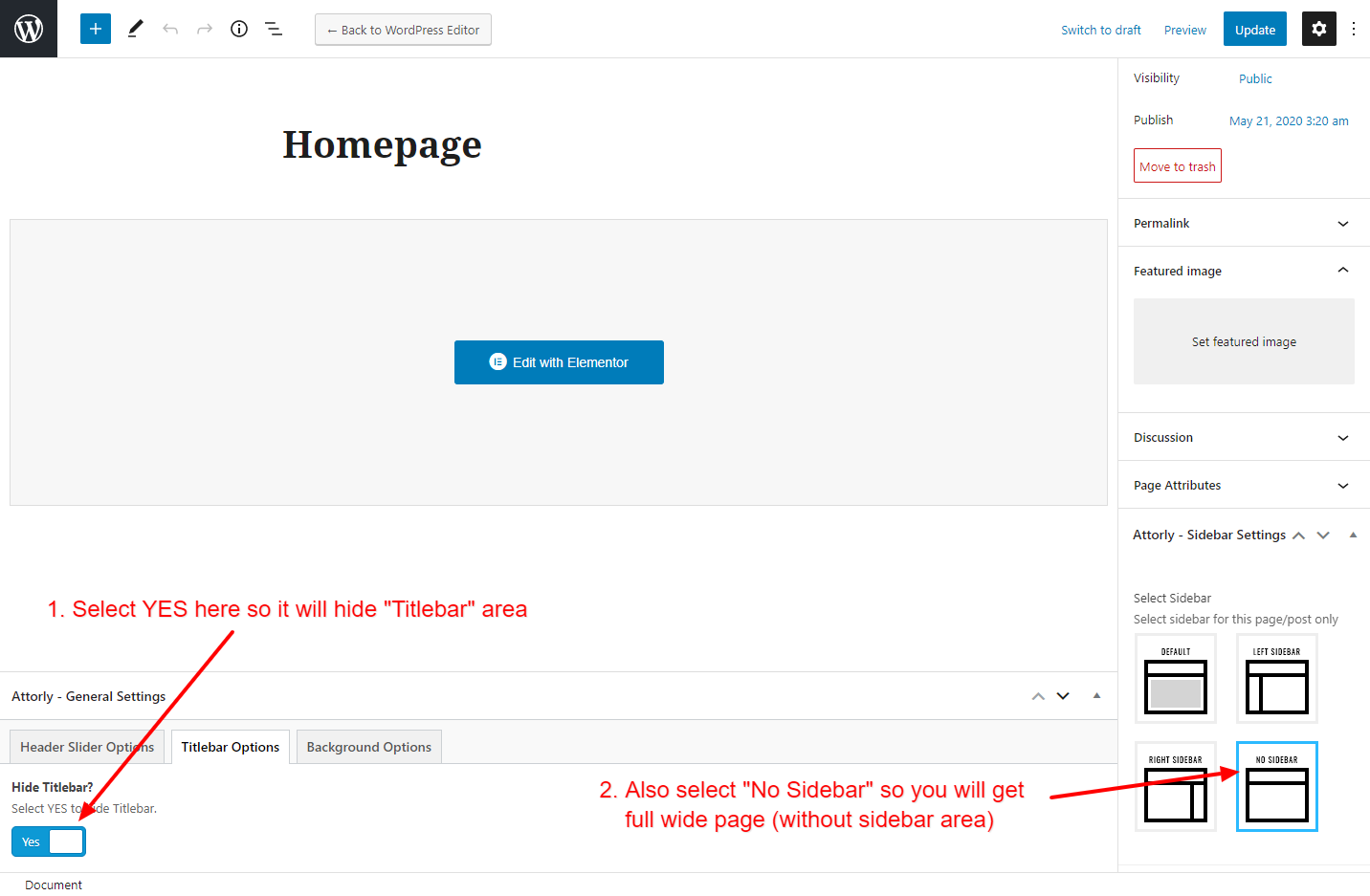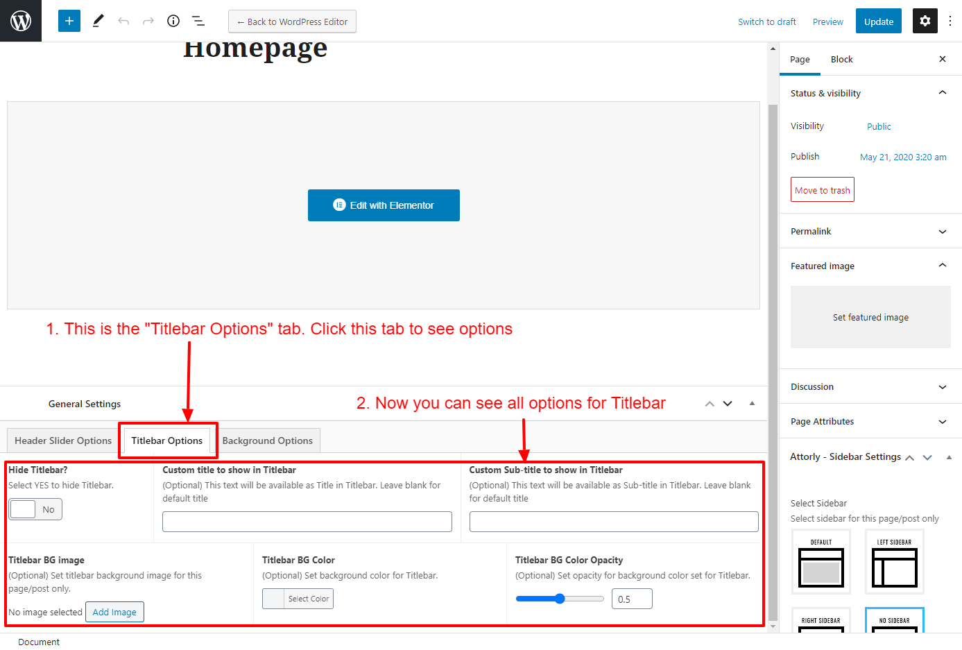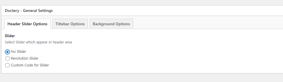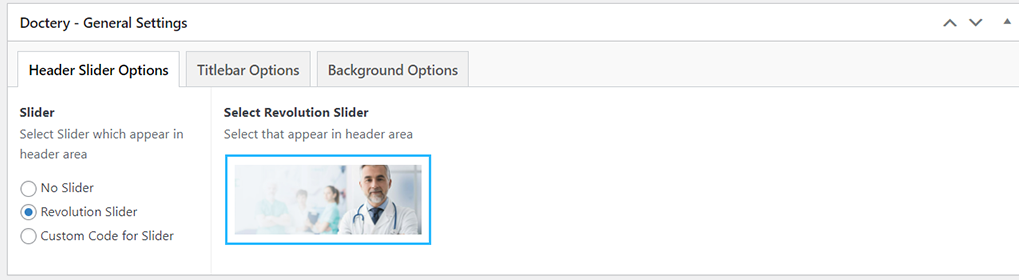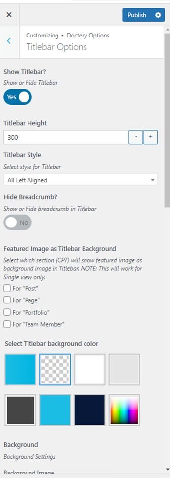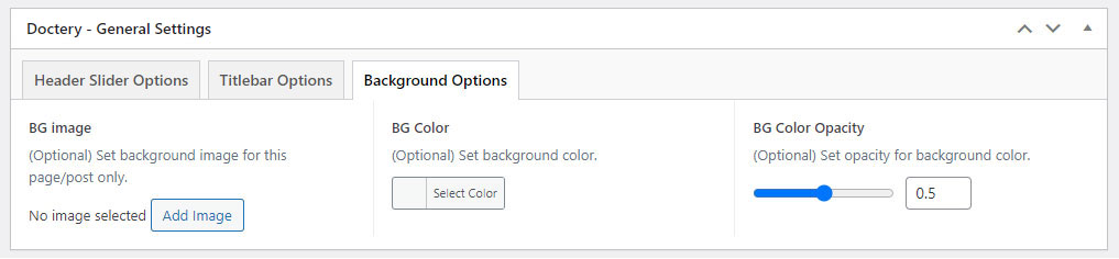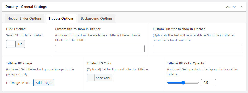This will override the options set under Doctery Options > Titlebar Settings options. This will help you to set special design the Titlebar on specific page or post.