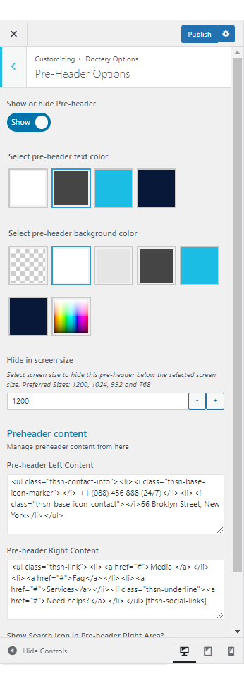 Pre-header section will appear above header area. You can show or hide it globally from Doctery Options >> Pre-header Settings section.