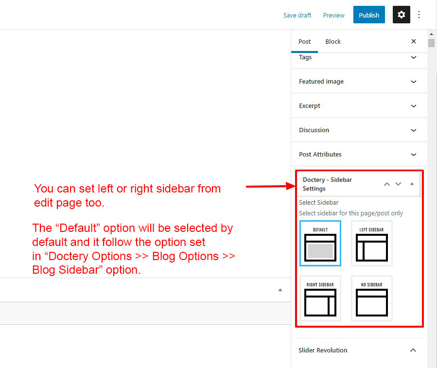 This is specially created sidebar postion (either left or right as selected in Doctery Options section) that will be shown as sidebar widget on Blog pages like blog list view, single post view, blog category view etc.