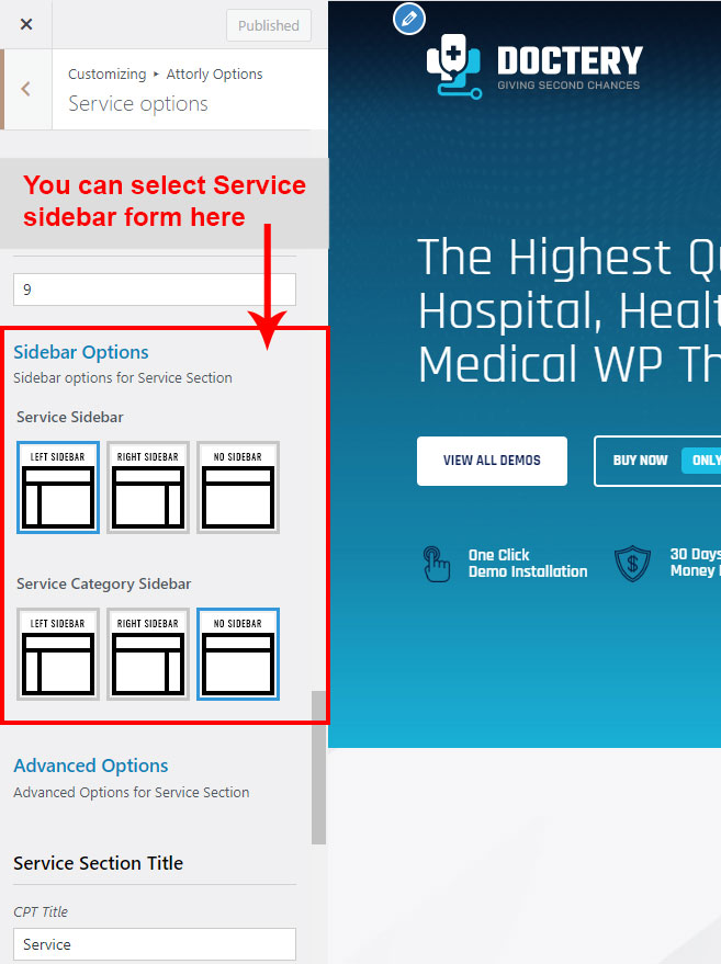 This is specially created sidebar postion for Service single view only. You can select sidebar view (left or right) in Doctery Options >> Service Options section. Also you can show single Service without sidebar too.