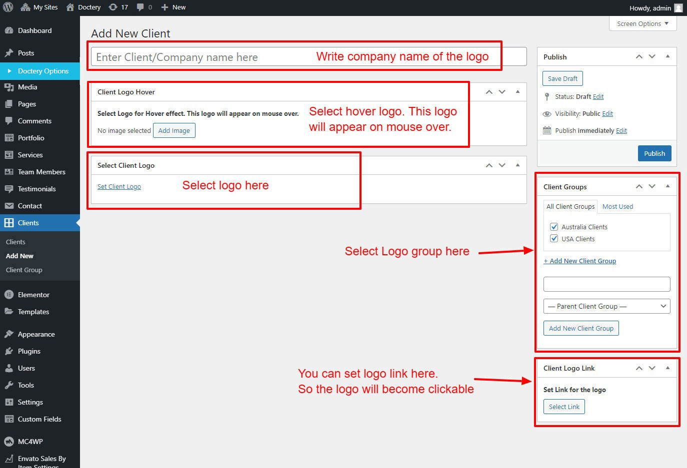 This will add a new logo. Repeat this steps and add some 3 or 6 client logo posts with the steps described above.