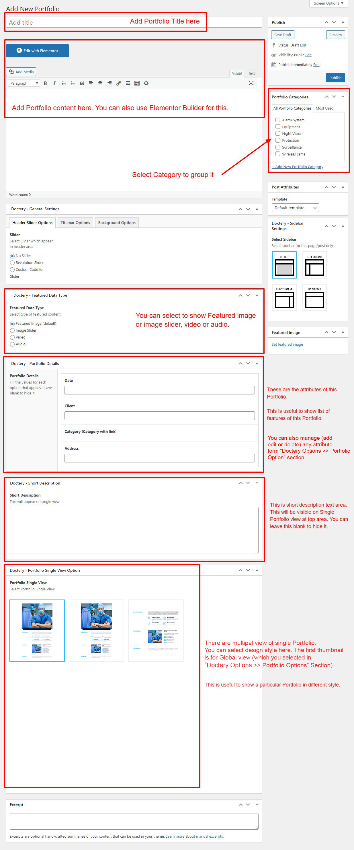 If you already done demo content setup than you can edit existing portfolio and check how we added data so you can understand each option perfectly.