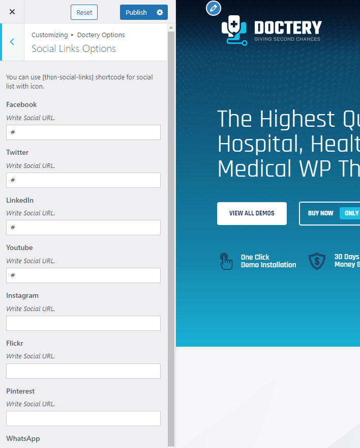This shortcode specially created to show social links. You can set social links in Doctery Options >> Social Links Section and write your social links. Than it can be shown using [pbmit-social-links] shortcode.