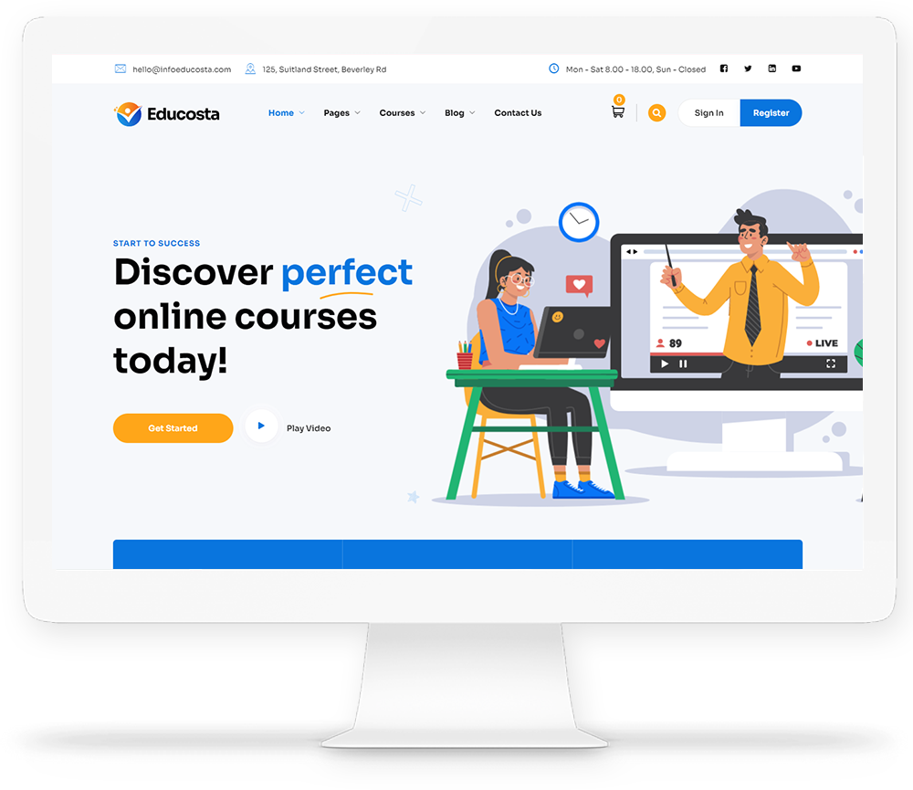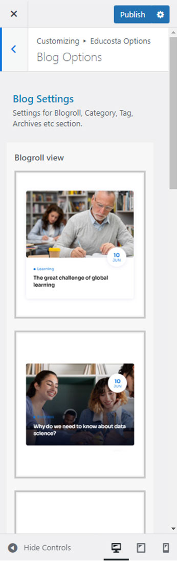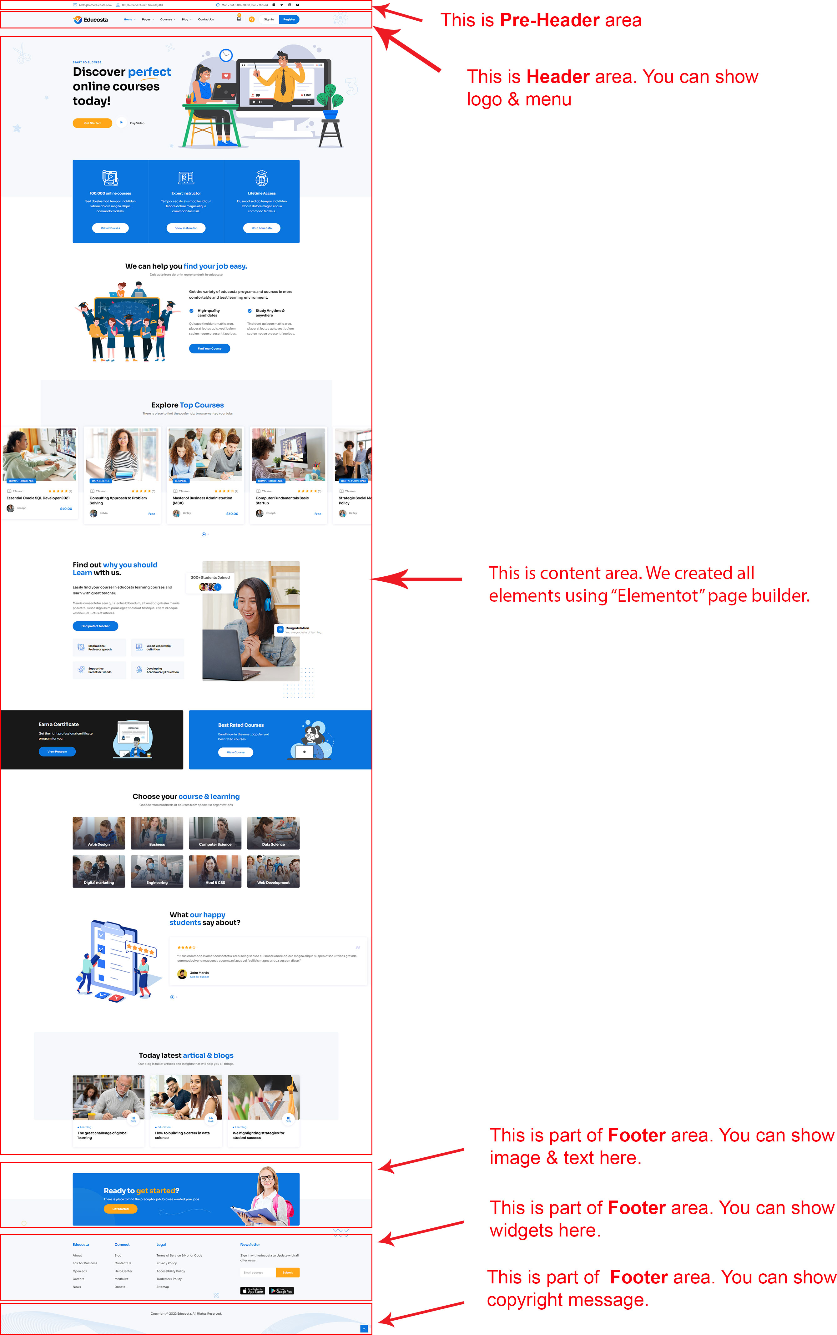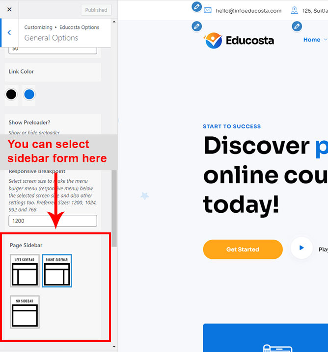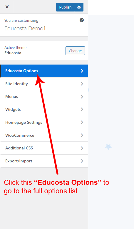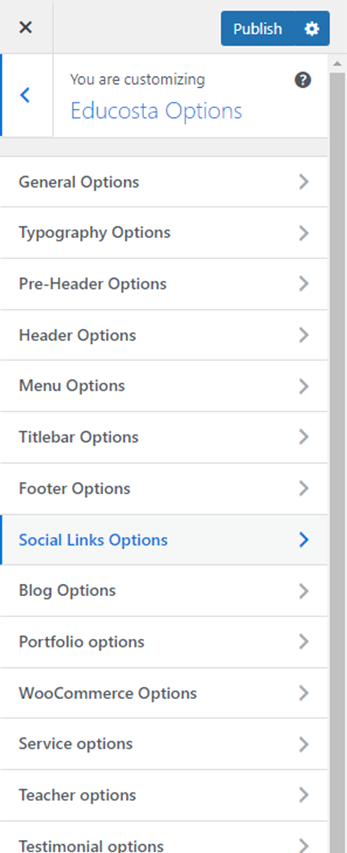 There are different sections in Educosta theme. Here you will find name of each section name so you can find their options easily. You can customize each sections from Educosta Options easily.