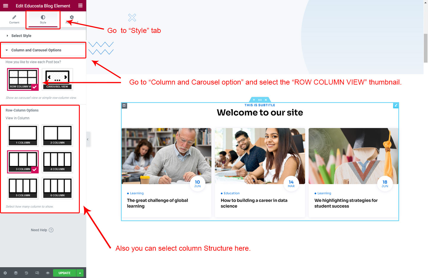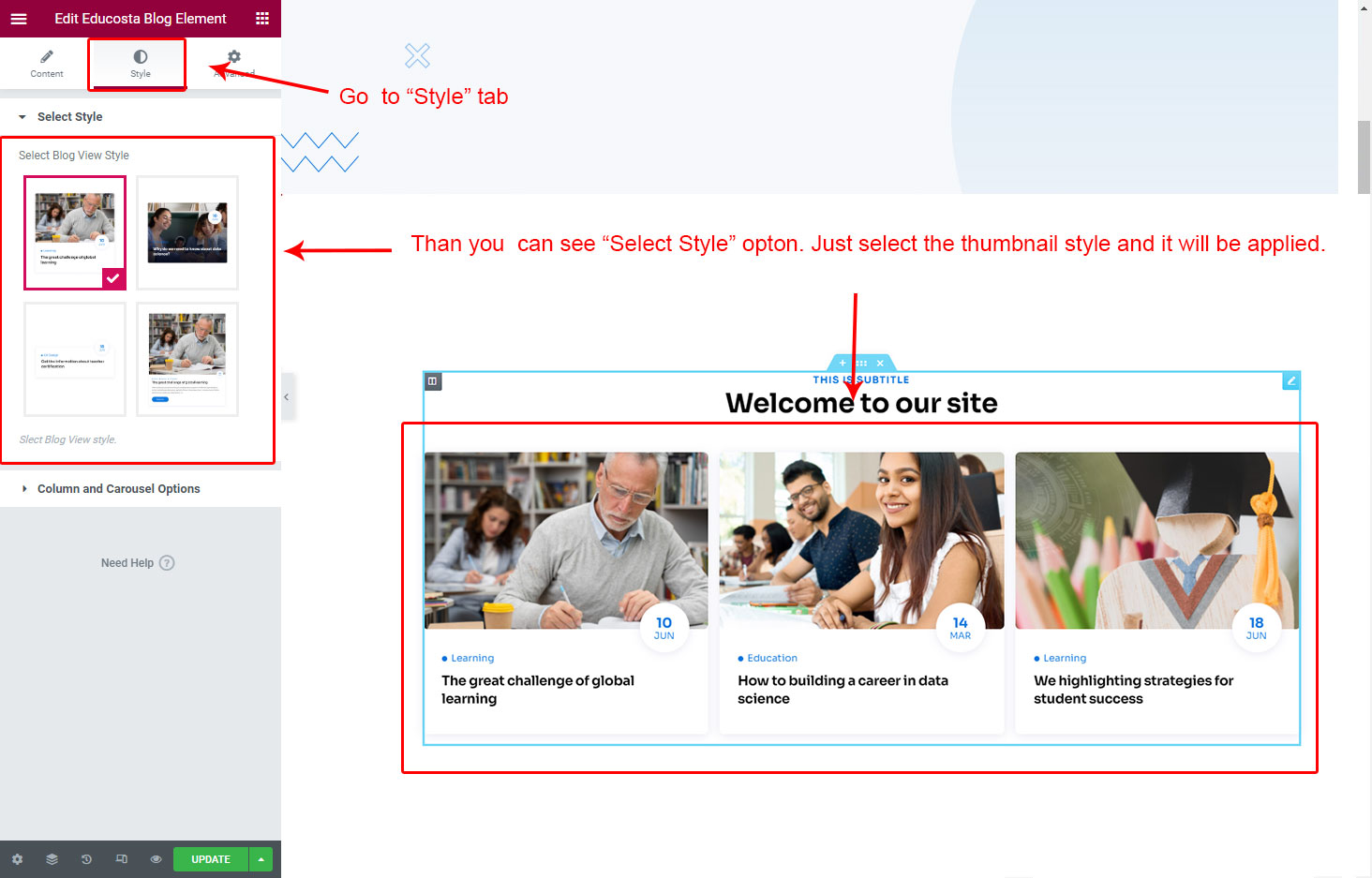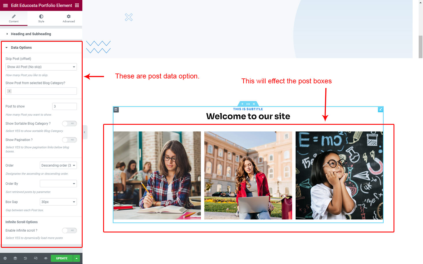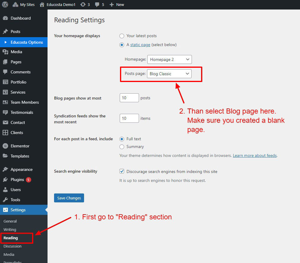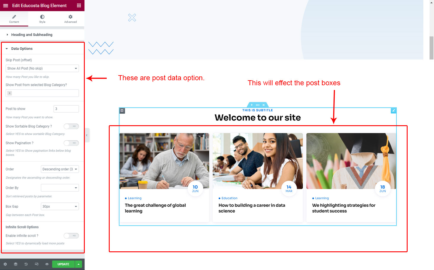 We created a Blog Element in Elementor Page Builder which you can use to show post on any page you want. Just drag and drop the Educosta Blog Element on any page and the post list will appear.