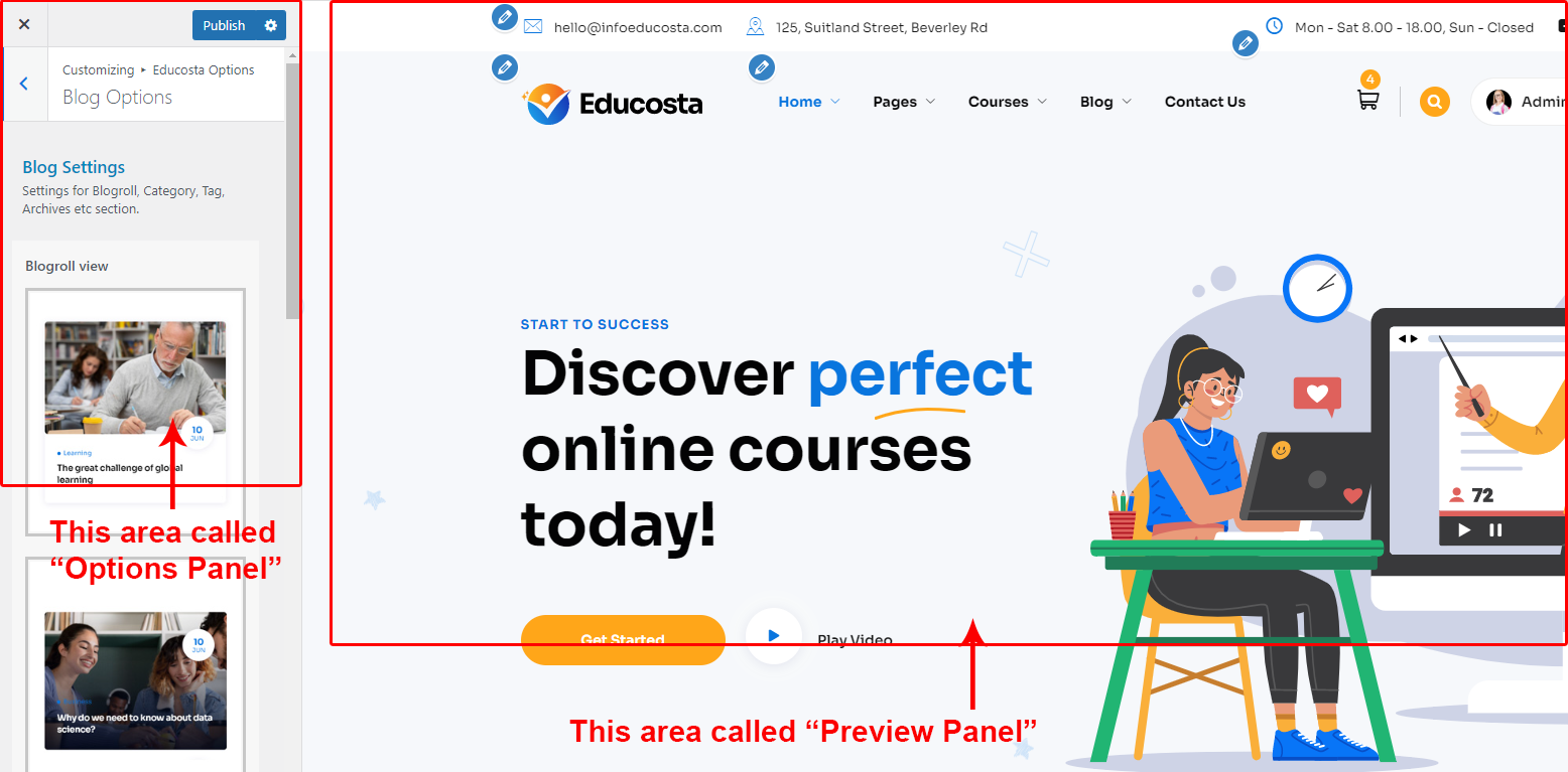 After clicking on the Educosta Options panel you will redirected to the Customize section. It has two sections. Left area called "Options Panel" and the right area called "Preview panel". See screenshot given below:
