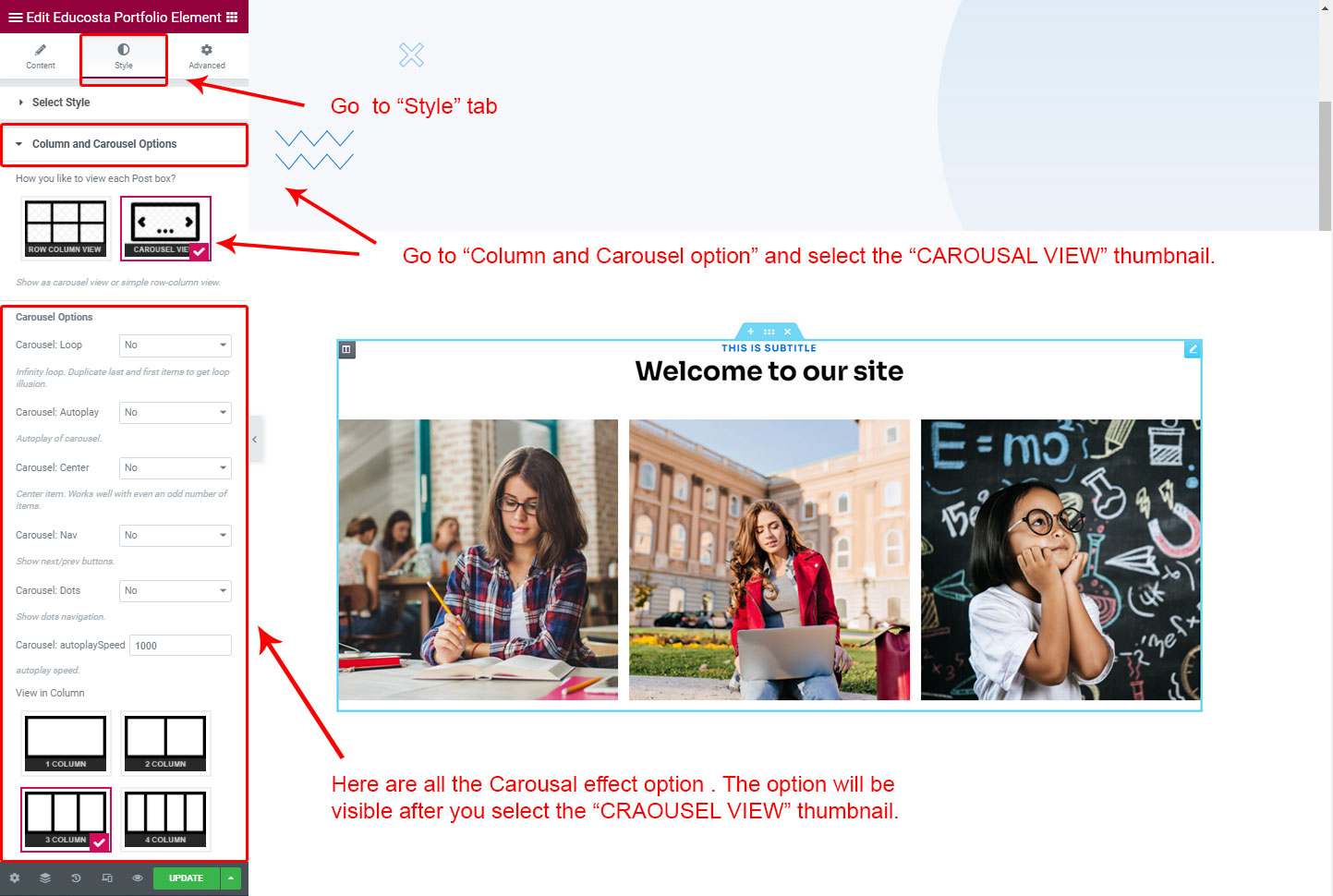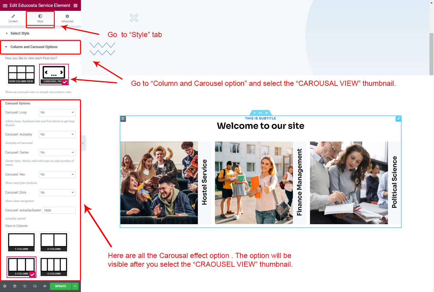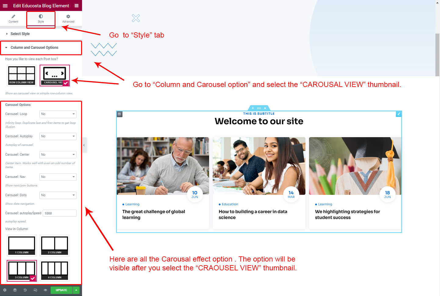 CAROSUEL VIEW: The Carousel view will be animated sliding view. There are lot's of options for the slideing animatins. Like animation speed, animation column, auto-play on or off, Loop post boxes, show/hide the dot or arrow navigation etc.
