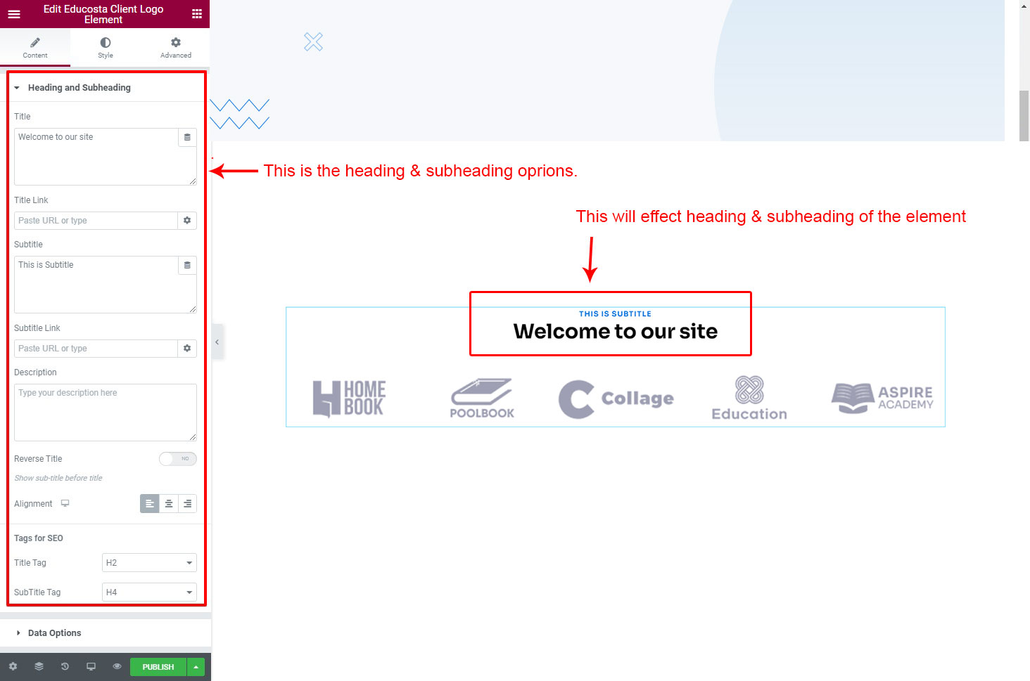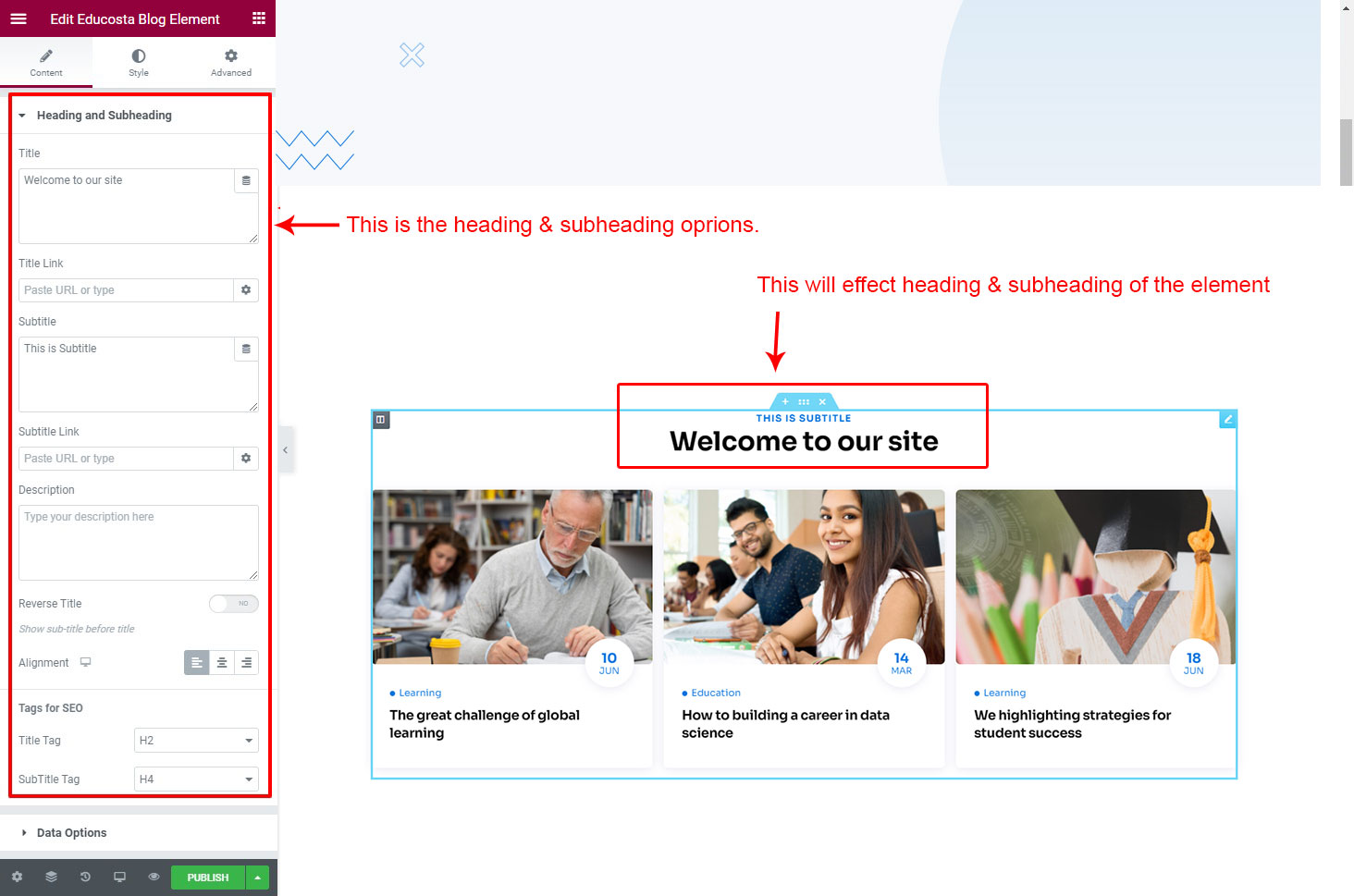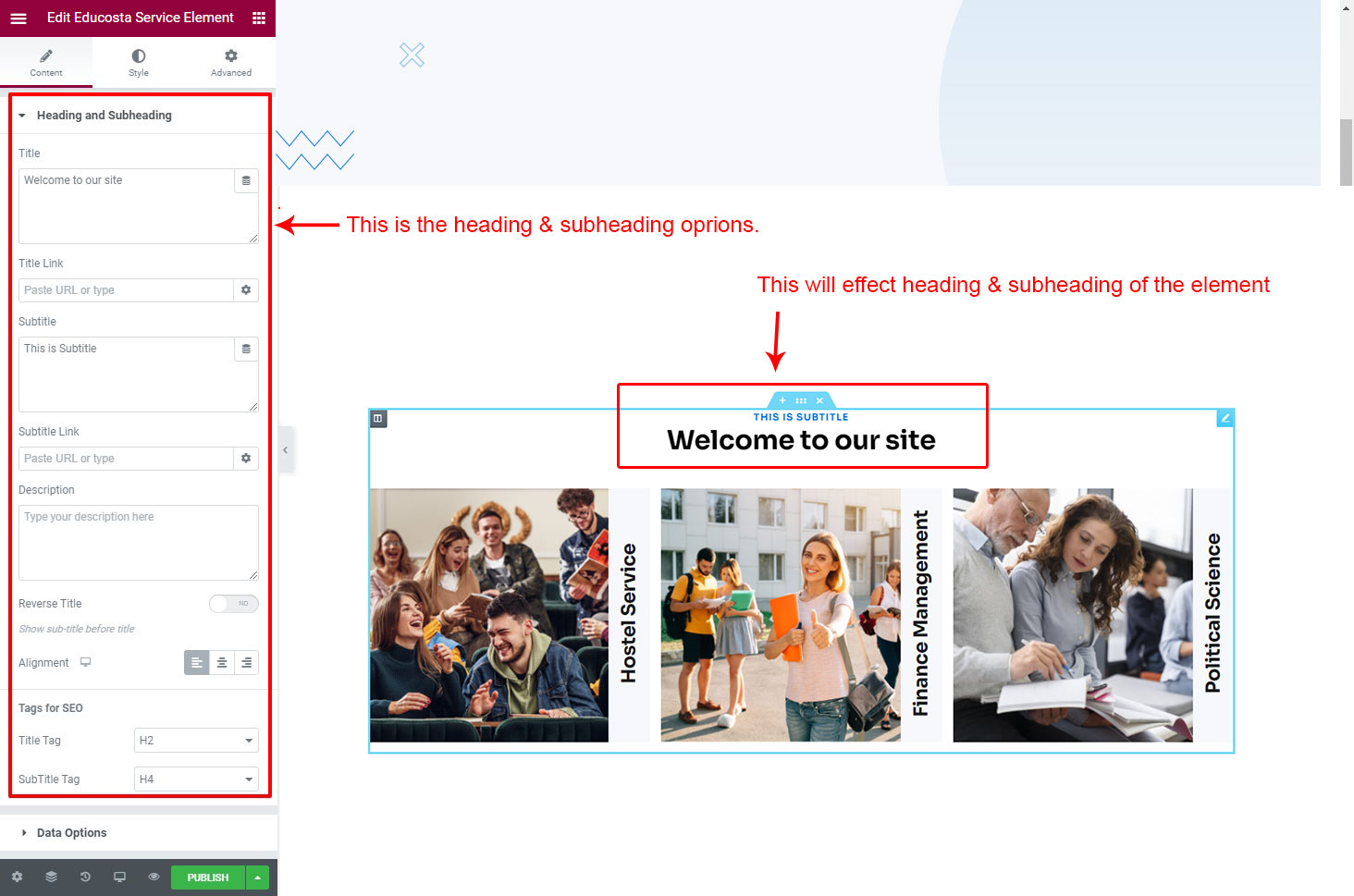 The heading and subheading will appear at top of the element. You can change text, add link to the heading or subheading, change alignment, change tag (for SEO purpose) etc.