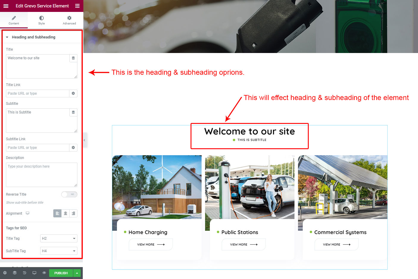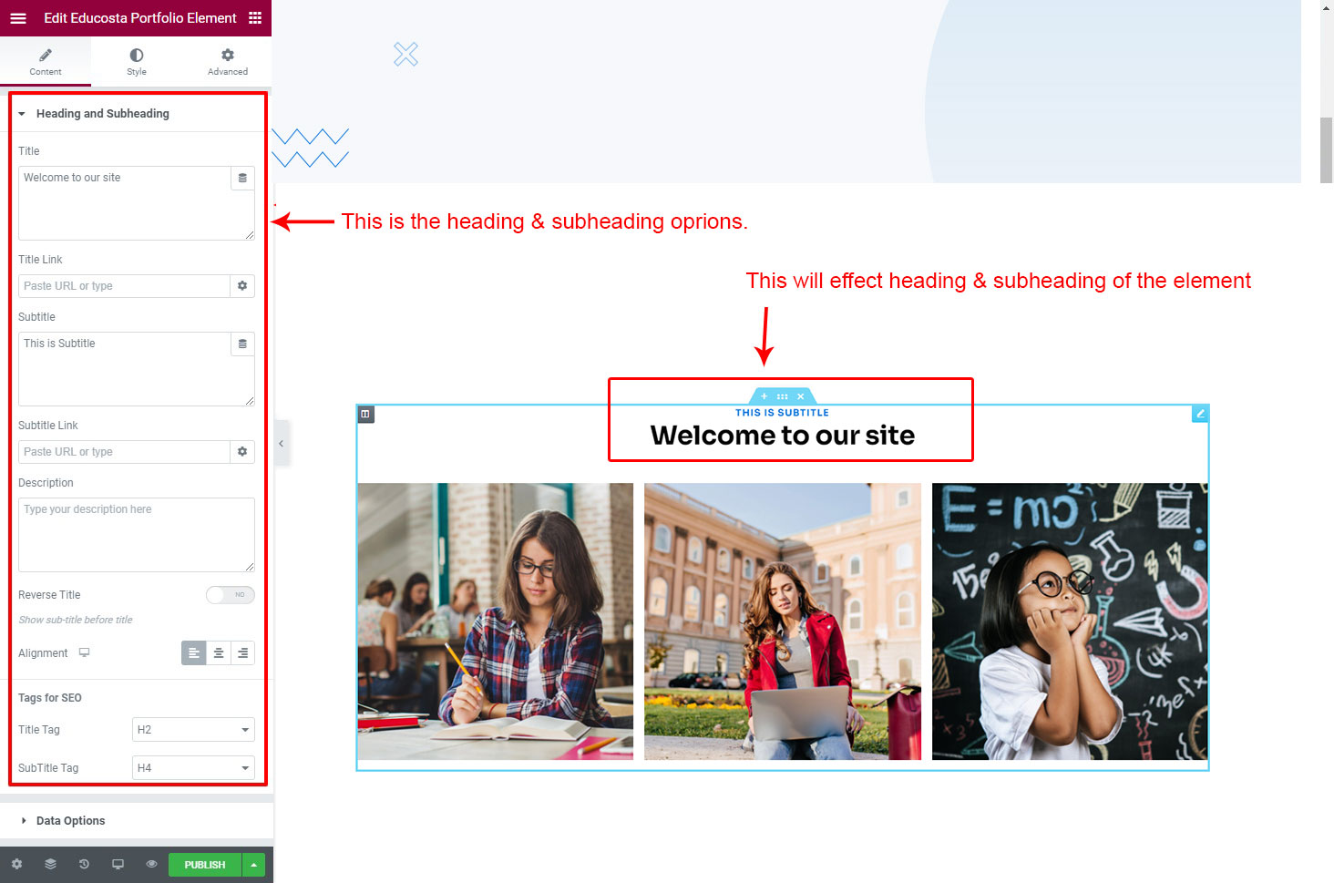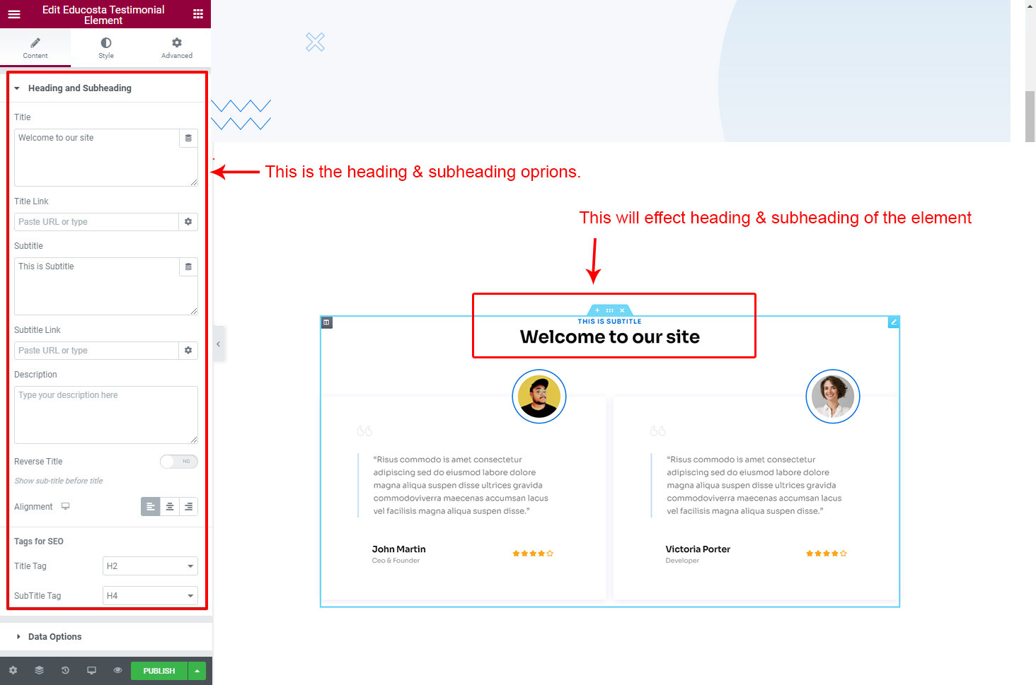 The heading and subheading will appear at top of the element. You can change text, add link to the heading or subheading, change alignment, change tag (for SEO purpose) etc.