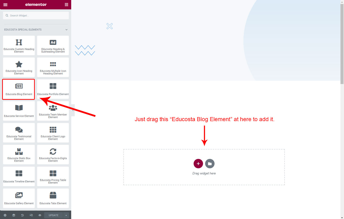 We created elements for display Courses and its category. So you can easily show all Courses on a page using Educosta Course Element. Create a new page and add Educosta Course Element on a page by dragging it. You can also display coures category using Educosta Course Category Element.