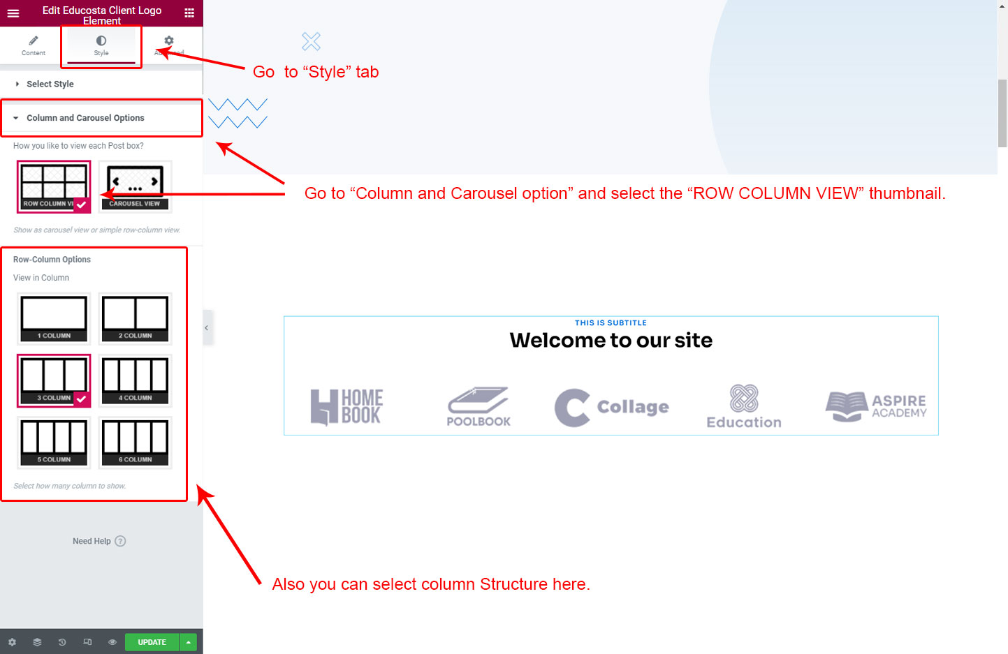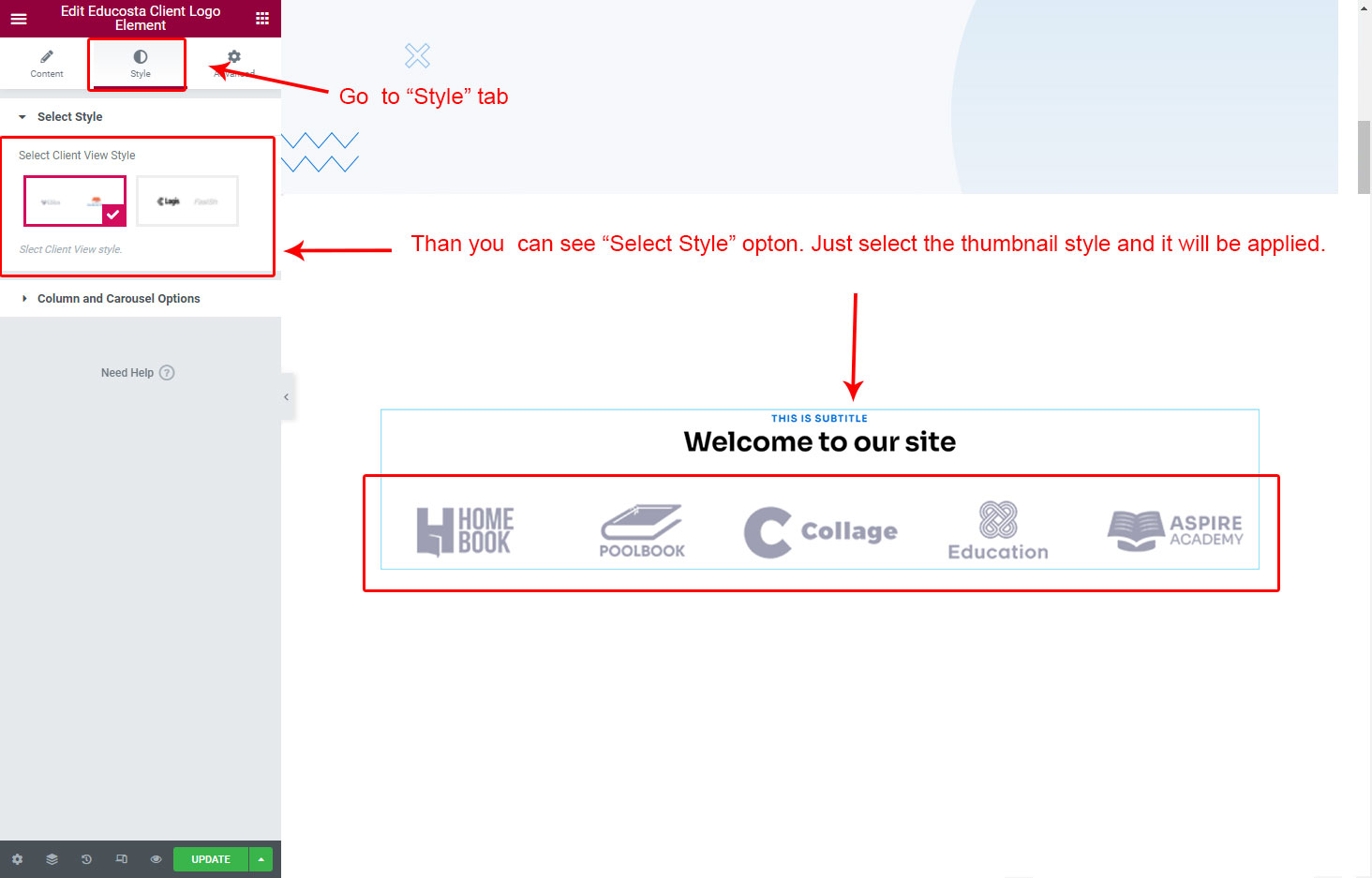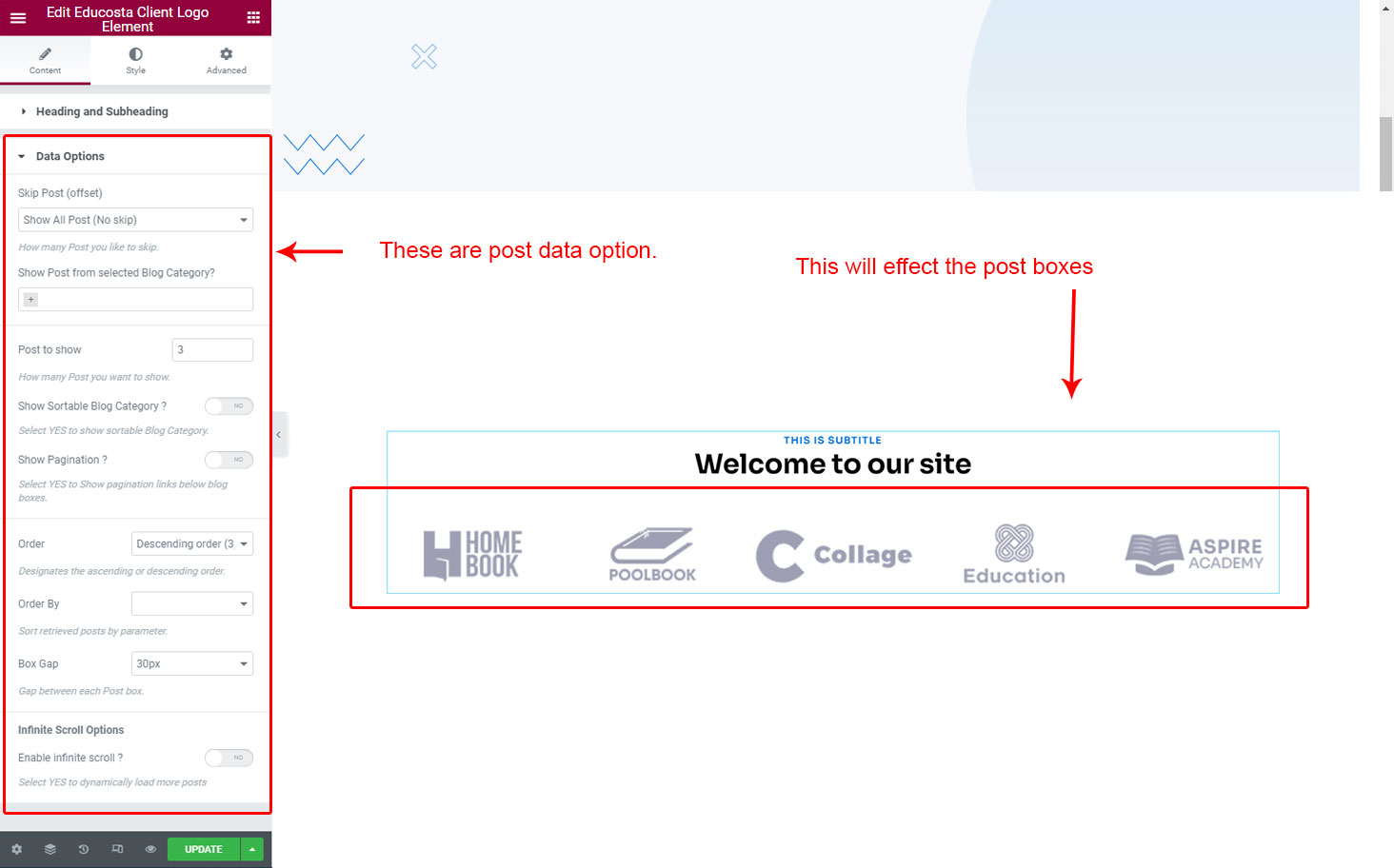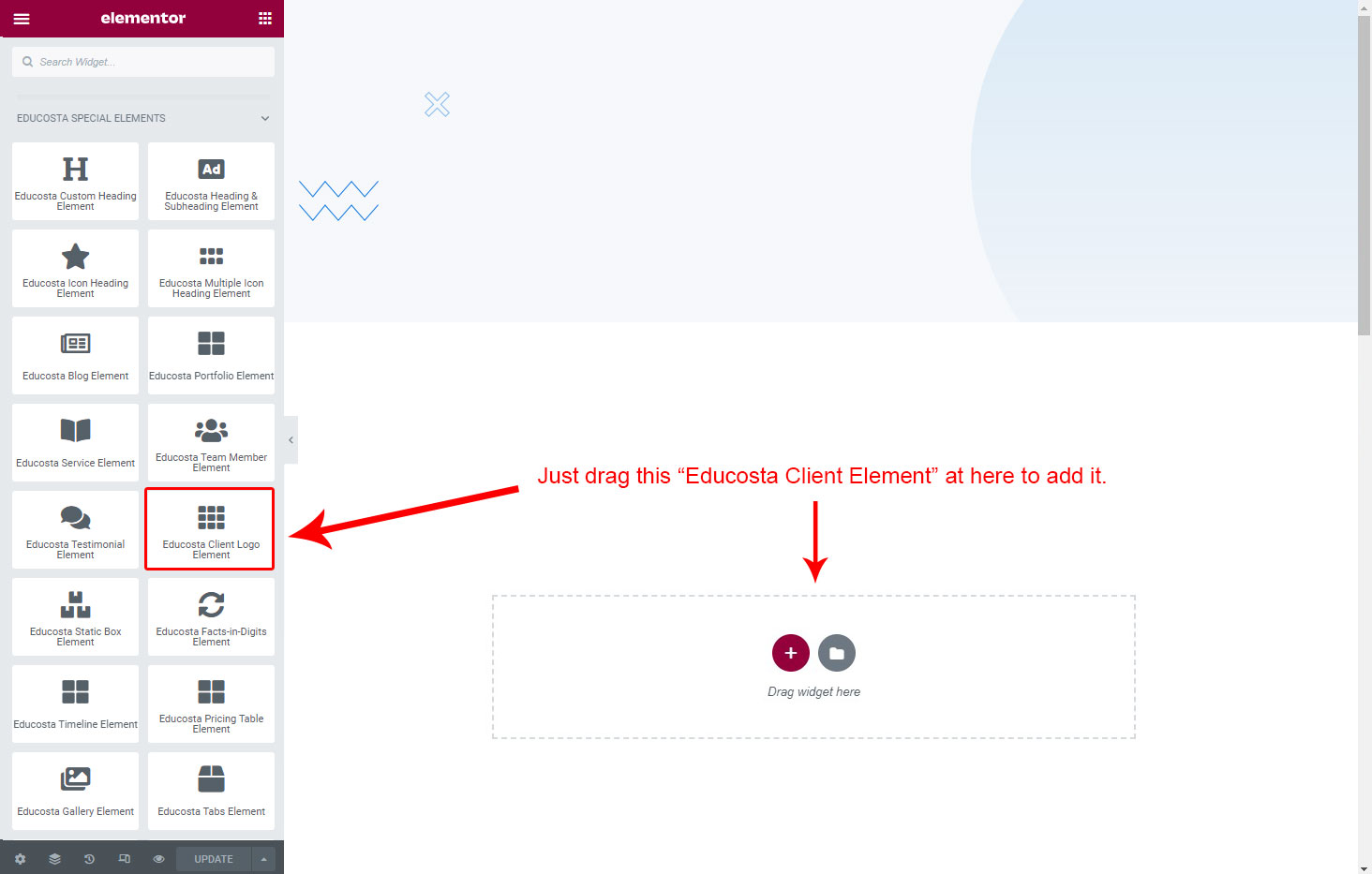 Now we have some Client Logo posts. So we can show all Client Logo on a page. Create a new page and add Educosta Client Logo Element on a page by dragging it.