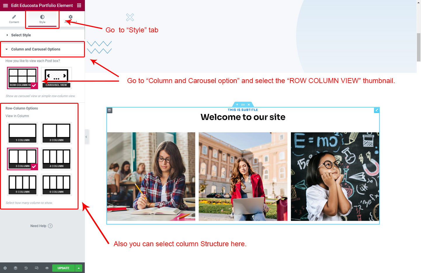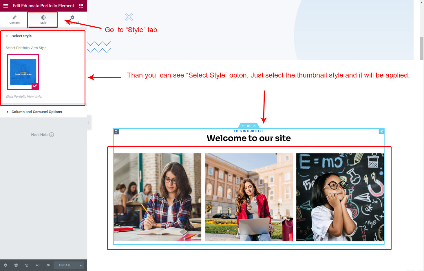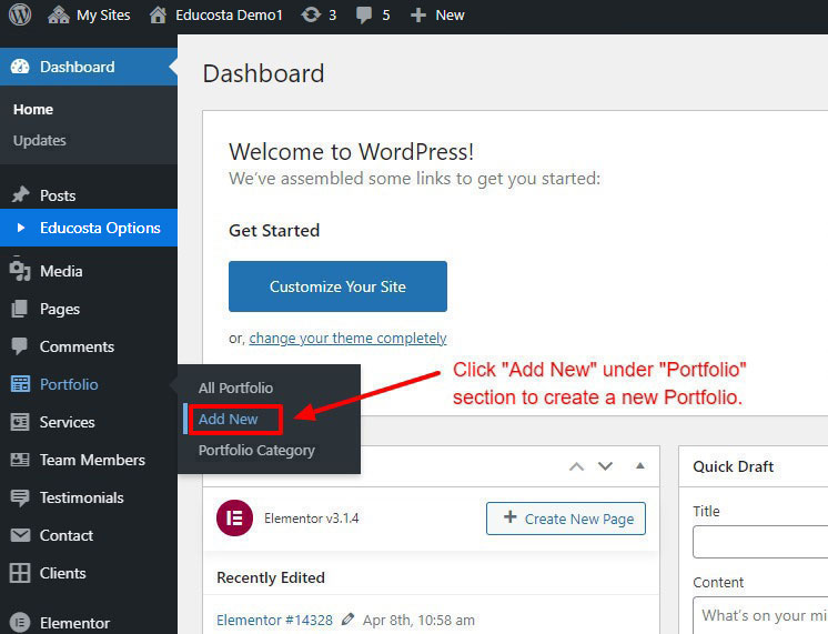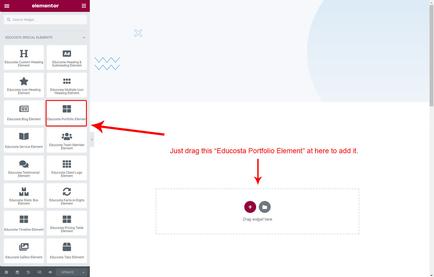 Now we have some Portfolio posts. So we can show all Portfolio on a page. Create a new page and add Educosta Portfolio Element on a page by dragging it.
