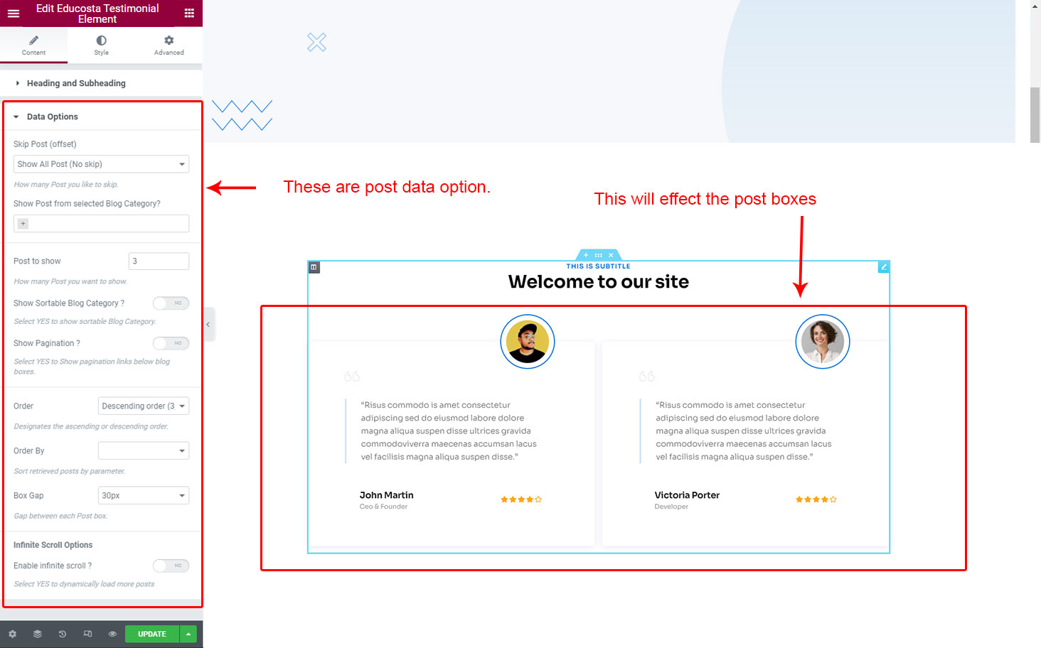 You can select the testimonial options here. Like how many testimonial you like to show, show testimonial from selected group (category), testimonial order etc.