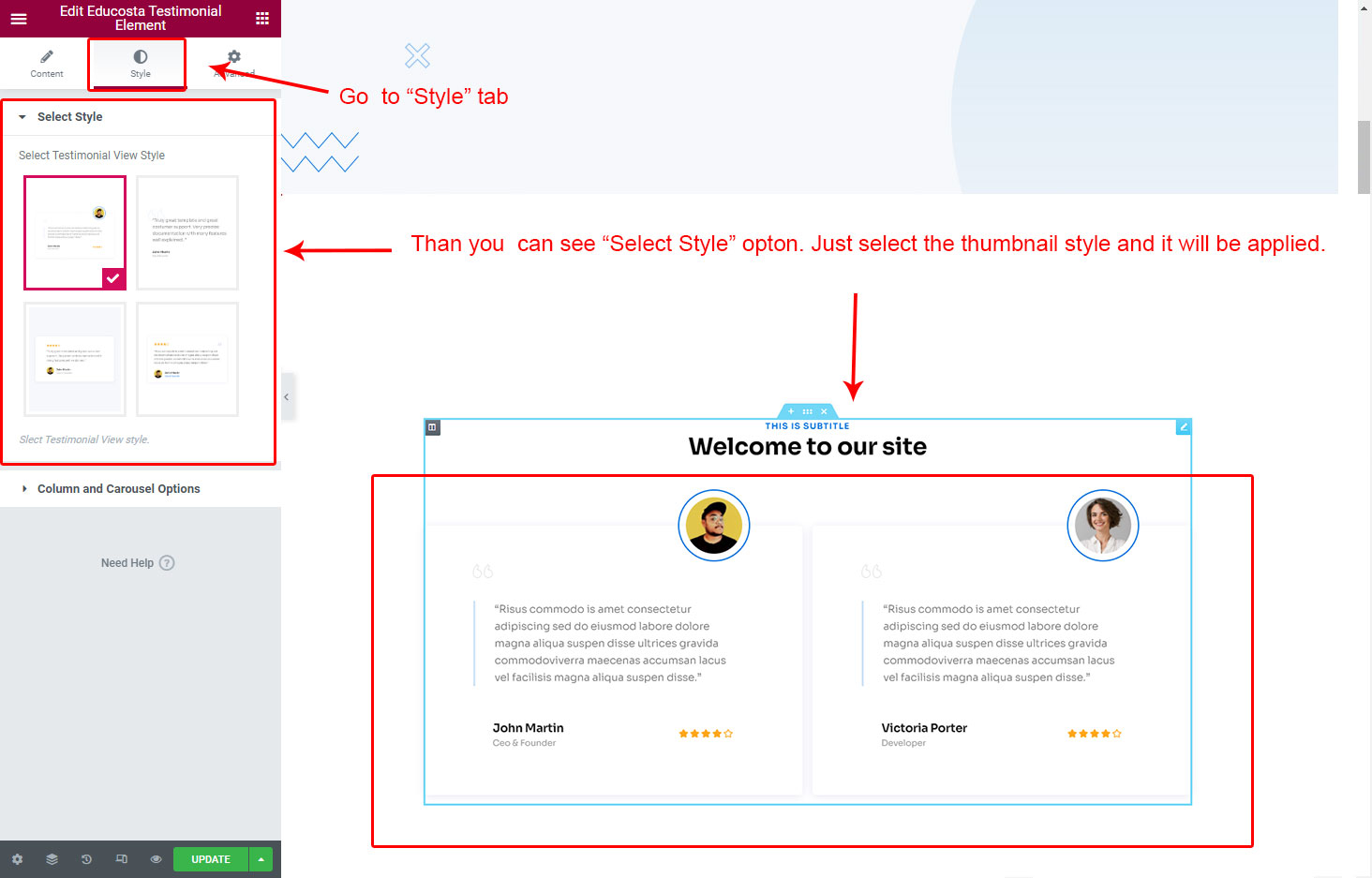 Just go to Testimonial section and create some testimonial. Here is the full detail about how to create a Testimonial:
