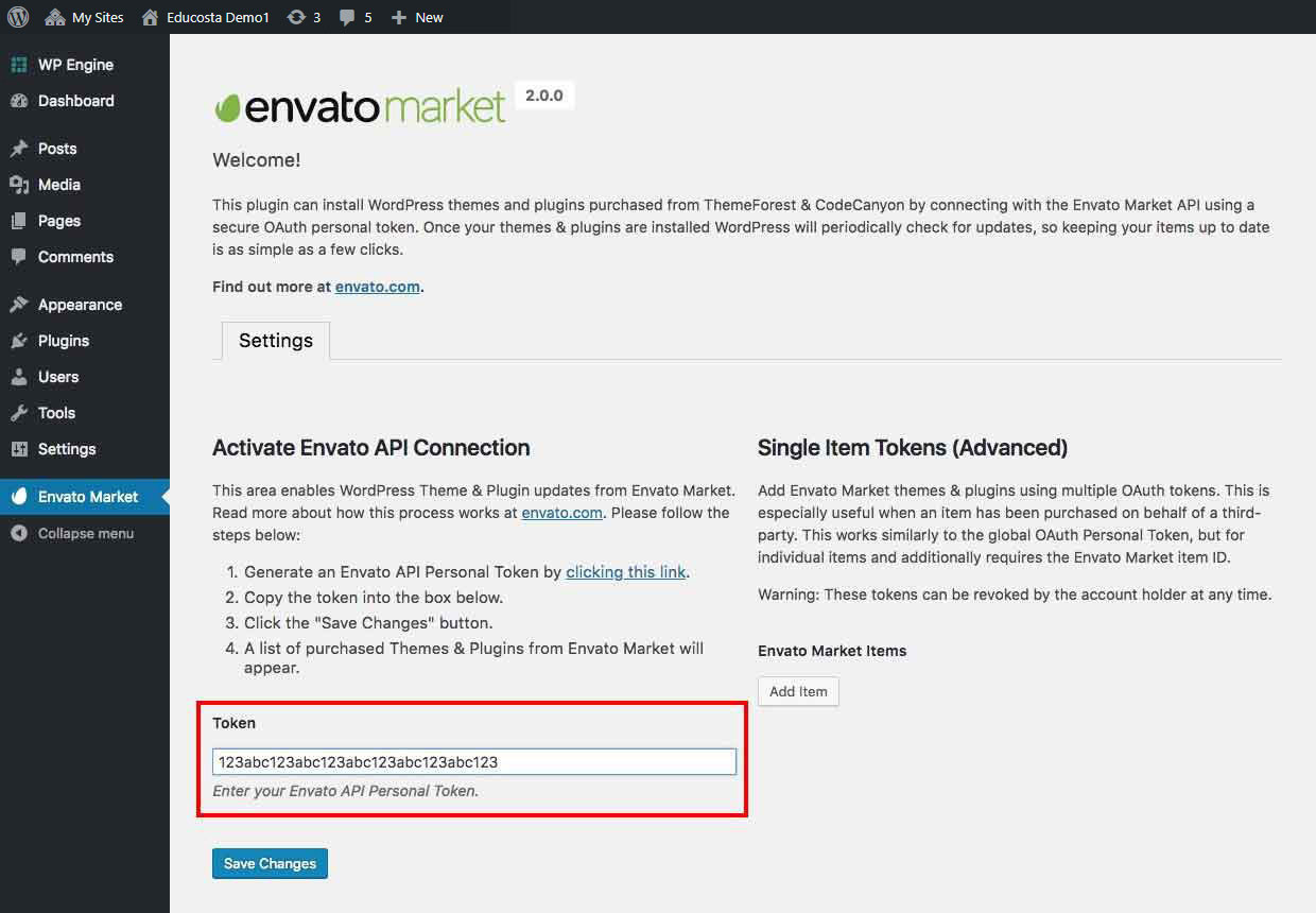 Now go back to your WordPress installation and paste in your Envato API token then click save.