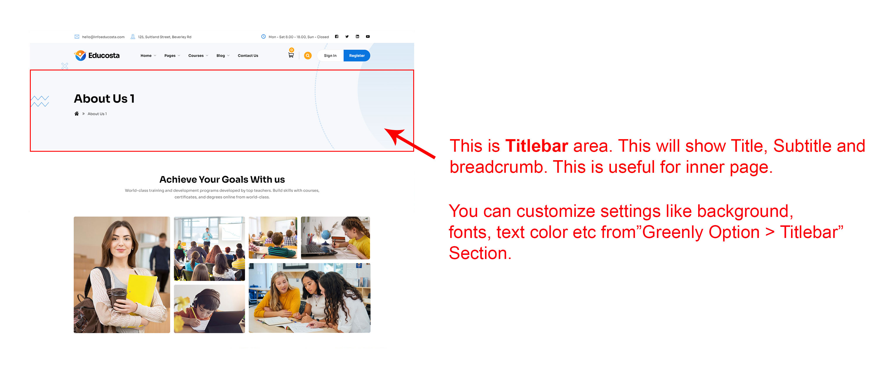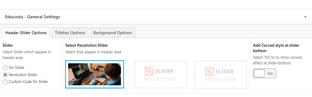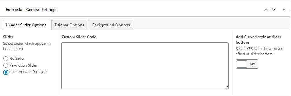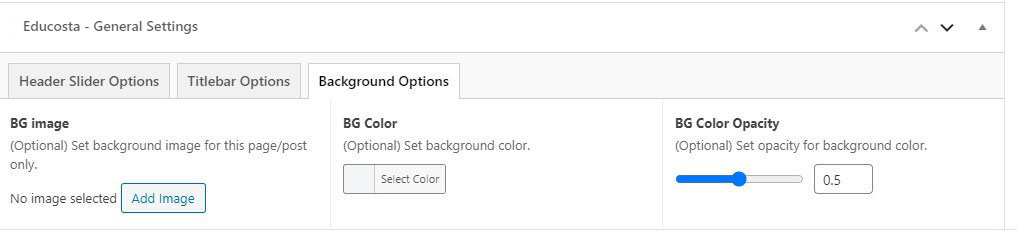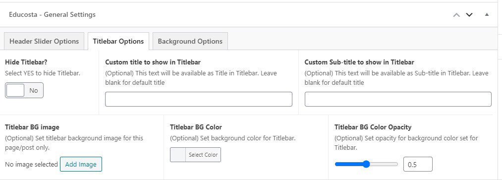 This will override the options set under Educosta Options > Titlebar Settings options. This will help you to set special design the Titlebar on specific page or post.