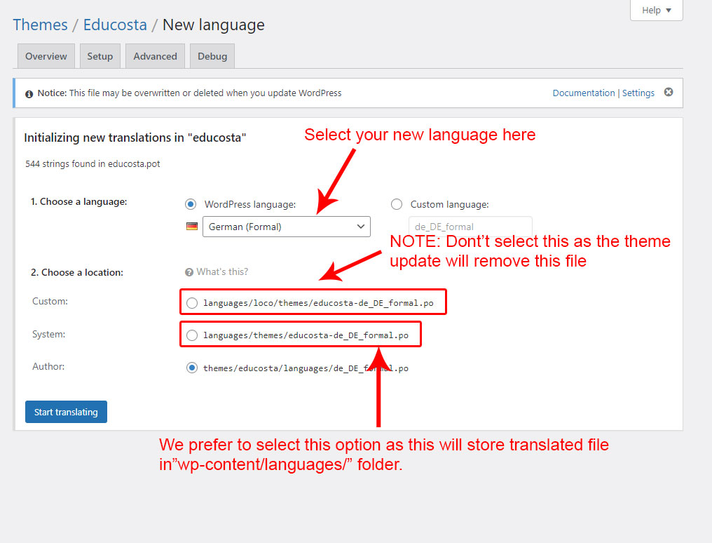 Within this section, you’ll find everything you need to localize and internationalize the Educosta theme into your language. It is split into several subsections to help you easily find what you need. There are different ways for this: