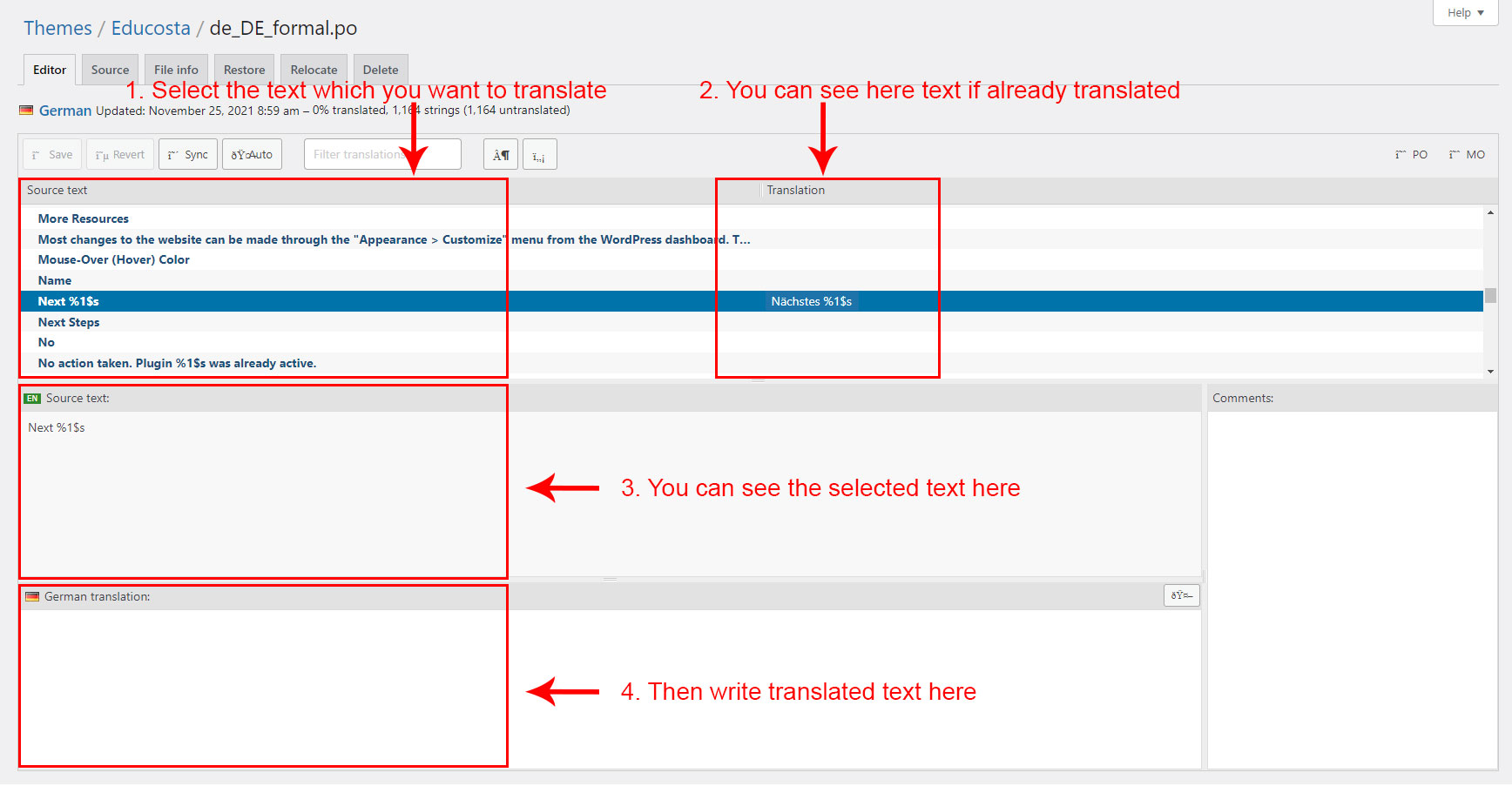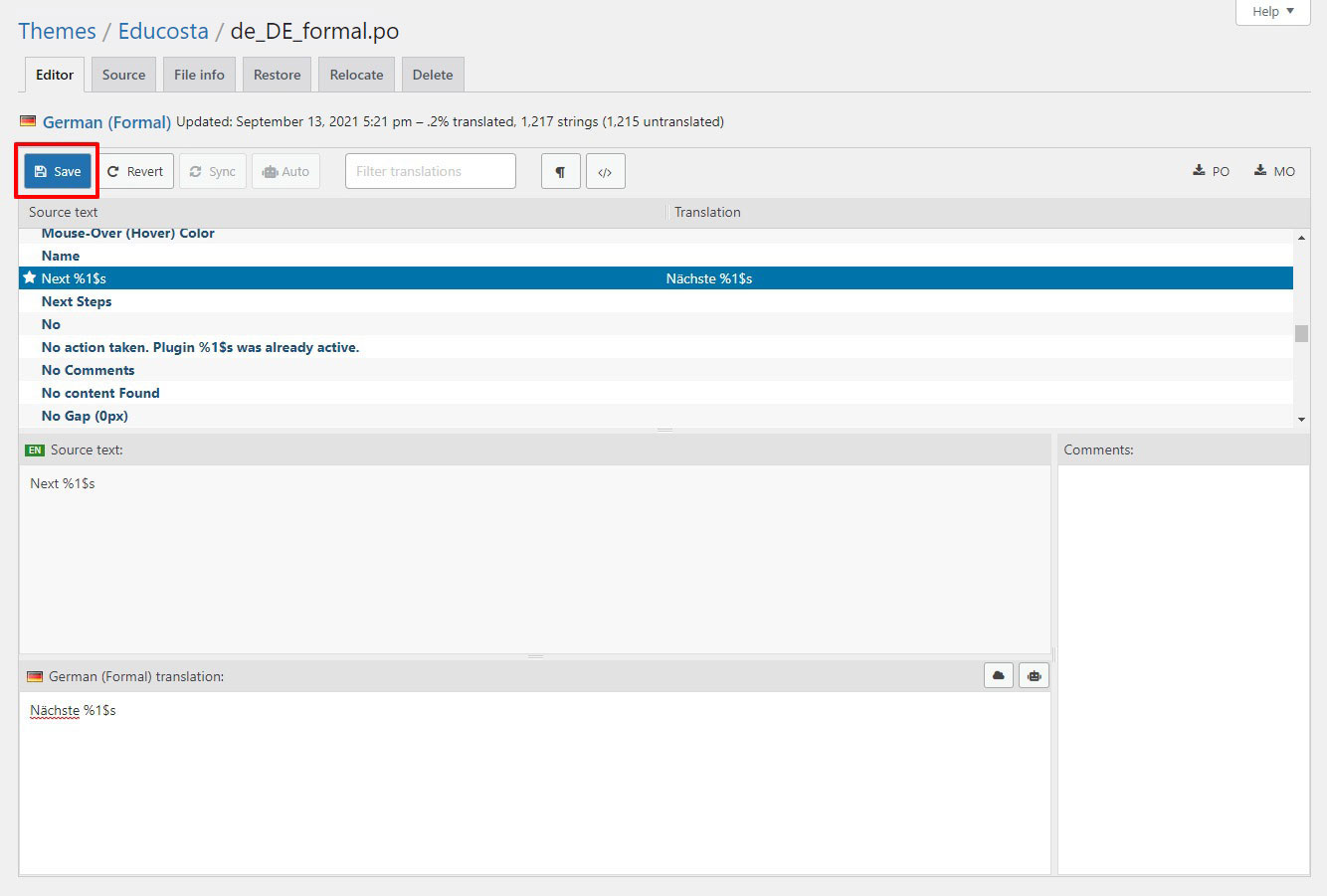 When you are done translating all the needed text strings into your desired language, save the file in /wp-content/languages/themes/ folder with language code in name. For example, if you were translating to the Deutsch language, you would save it as educosta-de_DE.po. The corresponding educosta-de_DE.mo file will be auto created by POEdit software.