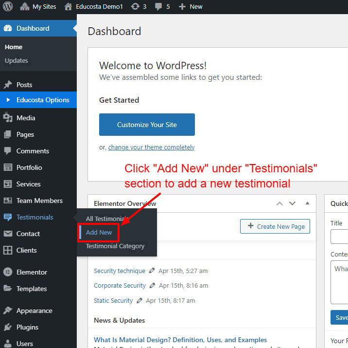 First go to Testimonial >> Add New to create a new Testimonial.