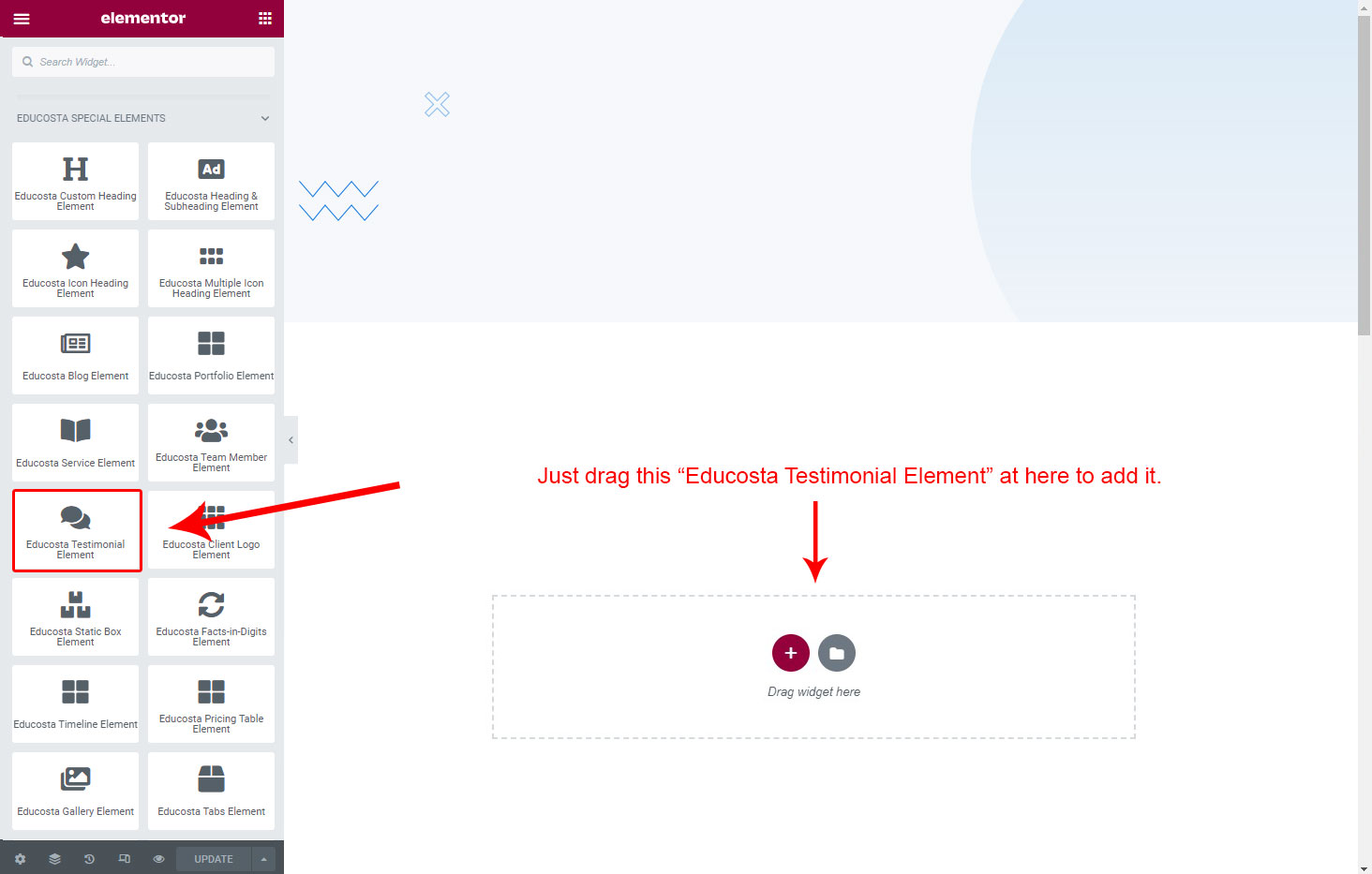 Now we have some Testimonial posts. So we can show all Testimonial on a page. Create a new page and add Educosta Testimonial Element on a page by dragging it.