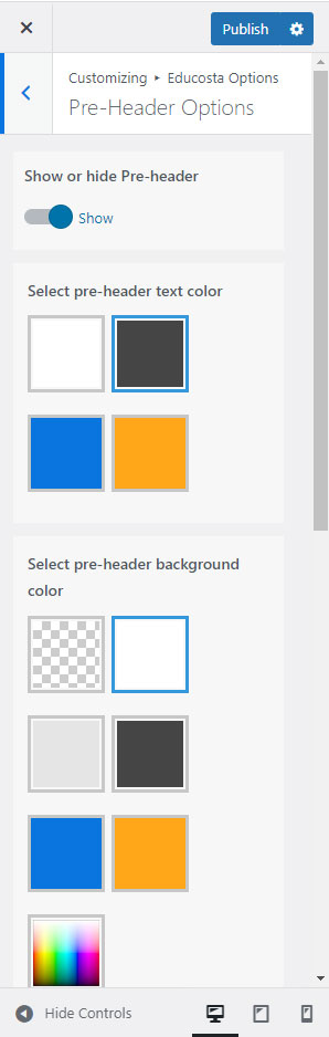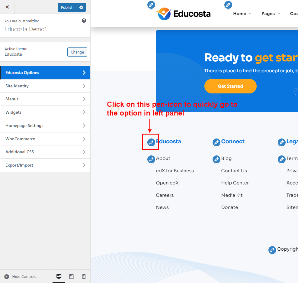 Educosta Options (Theme Options) panel is created with WordPress' Customize section. We added our own options with WordPress' default options.
