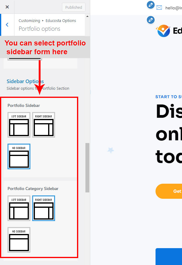 This is specially created sidebar postion for Portfolio Category view only. You can select sidebar view (left or right) in Educosta Options >> Portfolio Options section. Also you can show Portfolio Category without sidebar too.