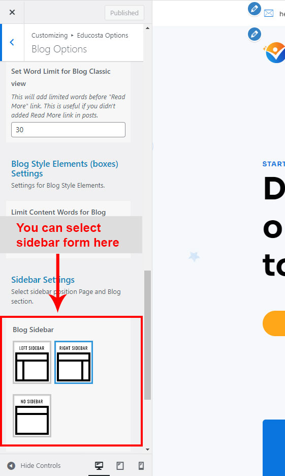 This is specially created sidebar postion (either left or right as selected in Educosta Options section) that will be shown as sidebar widget on Blog pages like blog list view, single post view, blog category view etc.