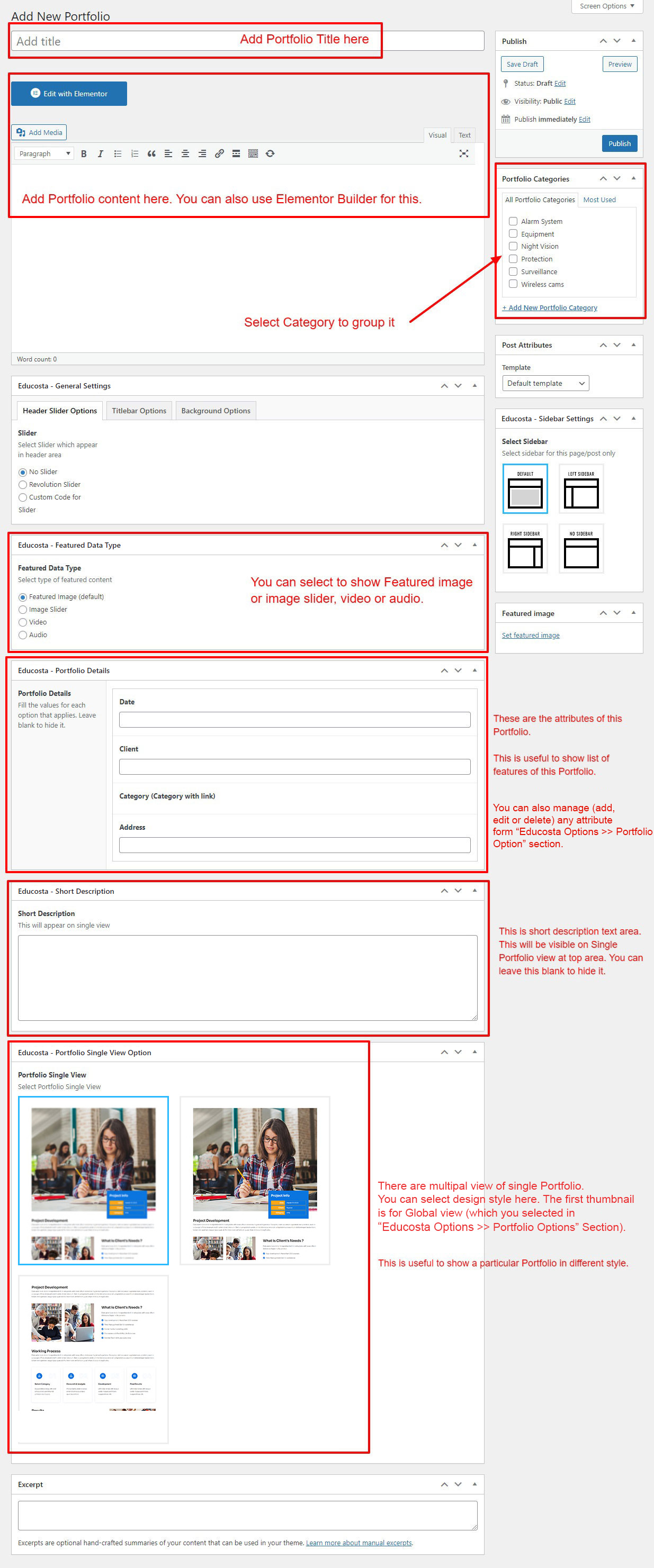 If you already done demo content setup than you can edit existing portfolio and check how we added data so you can understand each option perfectly.