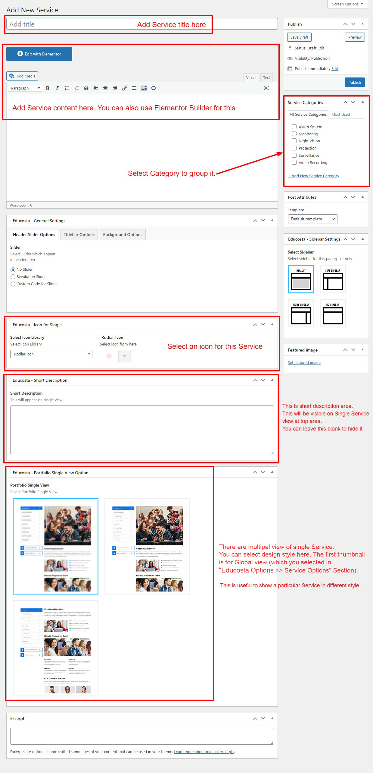 If you already done demo content setup than you can edit existing service and check how we added data so you can understand each option perfectly.