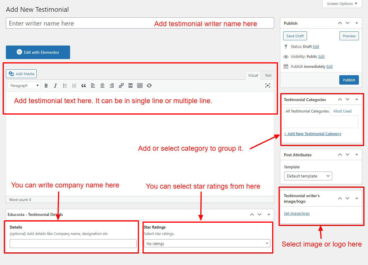If you already done demo content setup than you can edit existing testimonial and check how we added data so you can understand each option perfectly.