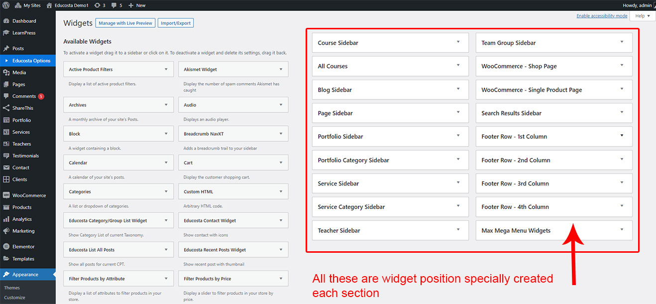 Educosta theme comes with widgets and different positions. We created special widget positions for each section so you can show sidebar and footer widgets properly according to content. Here are description of all widget positions:
