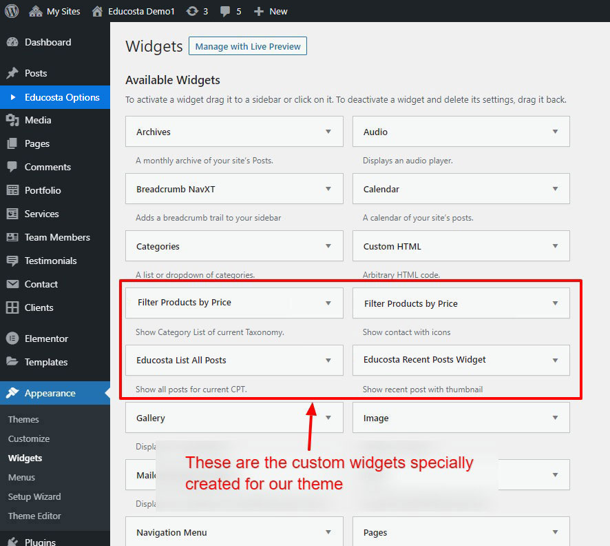 There are some widgets created specially for Educosta theme. Here are the widgets:
