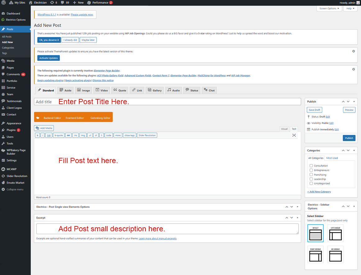 Theme setup is very easy. The setup wizard will link will be appear after you activate Electrico theme. The setup wizard will install plugins and then insert demo content setup like page/post content, widgets etc.. Here is full video you can understand the full process and know how easy it to setup demo content: