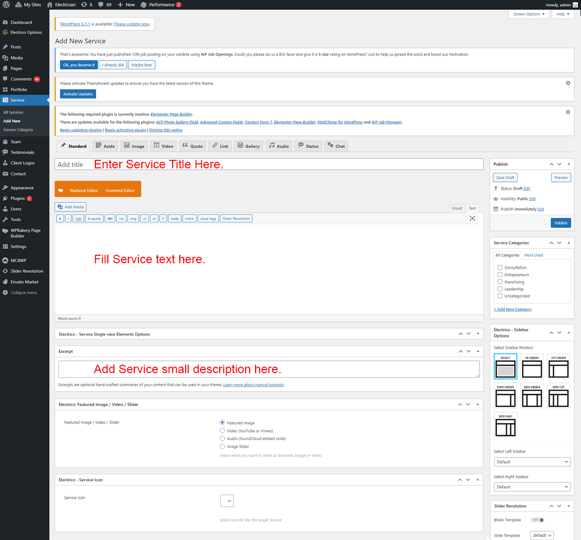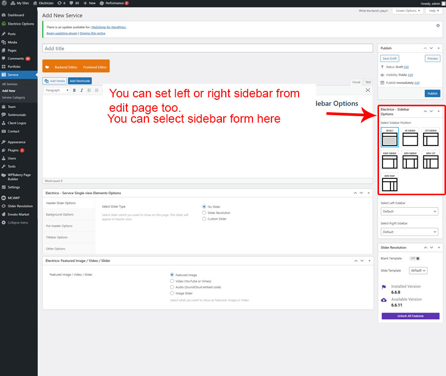 • Left Sidebar For Service: You can add Widgets that you want to display as Left sidebar for Service page only.