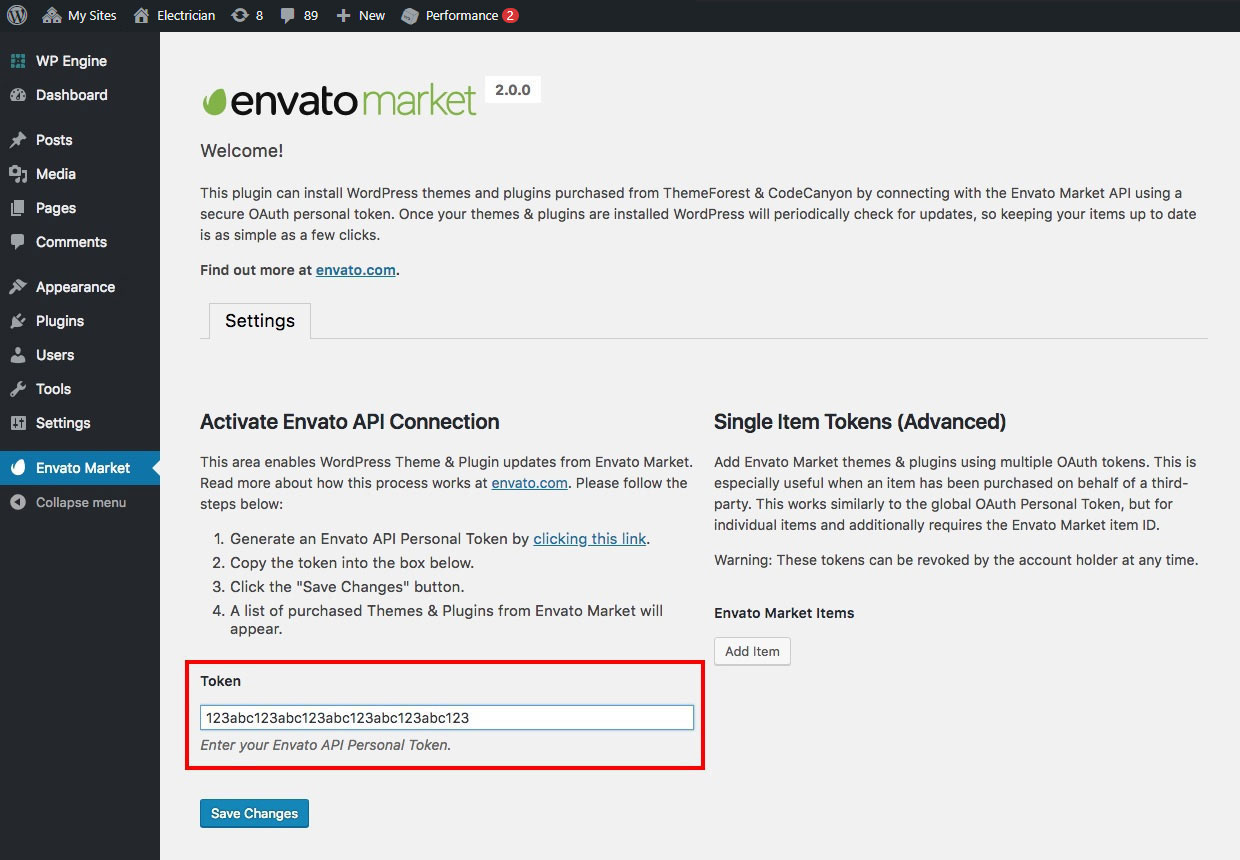 • Now go back to your WordPress installation and paste in your Envato API token then click save.