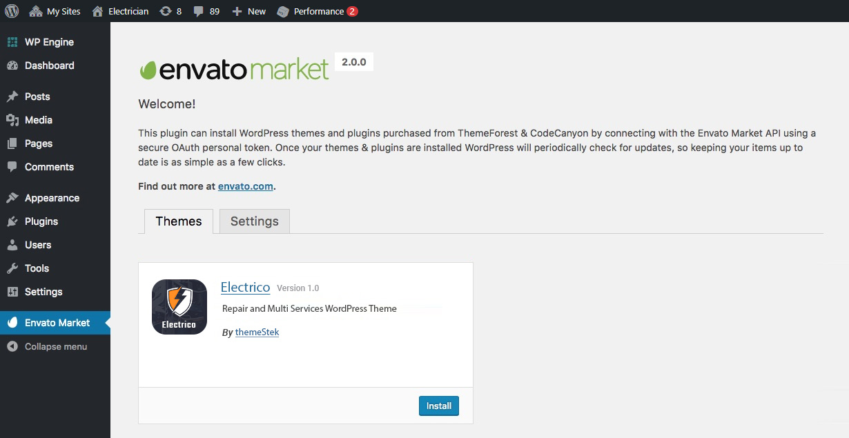 • Once your token is saved and validated your page will refresh to show your Envato Market landing page with added tabs for your items. The added tab(s) display all of your theme and plugin purchases as well as their version numbers and quick links to the theme and author pages. So now you can install theme and also update theme in just one click.