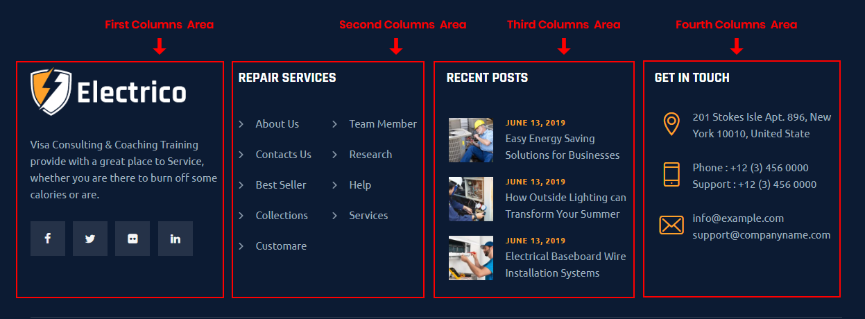 Electrico comes with special widget positions for footer area. Footer has TWO rows widget position with four widget columns in each: