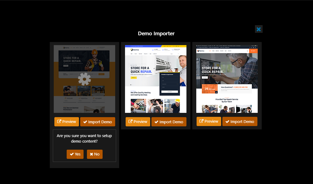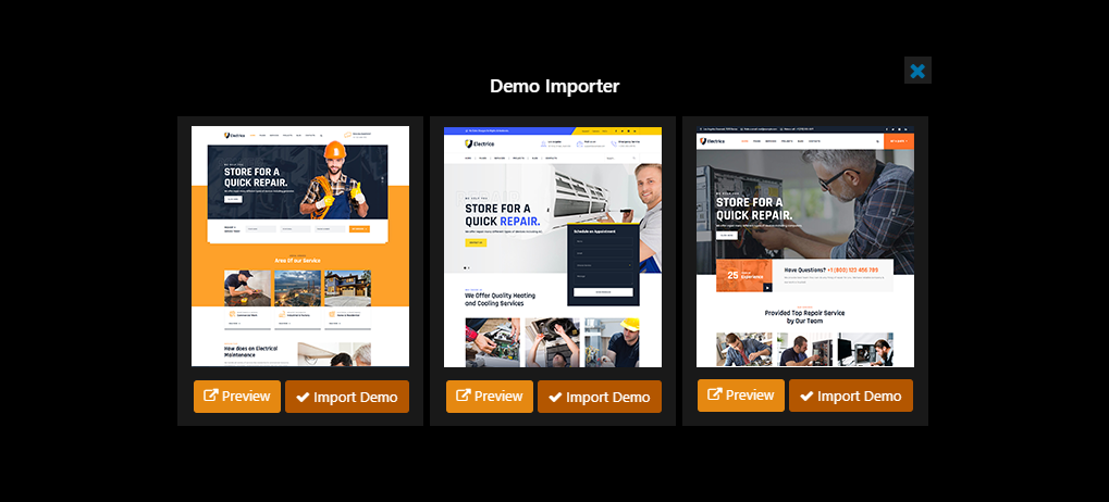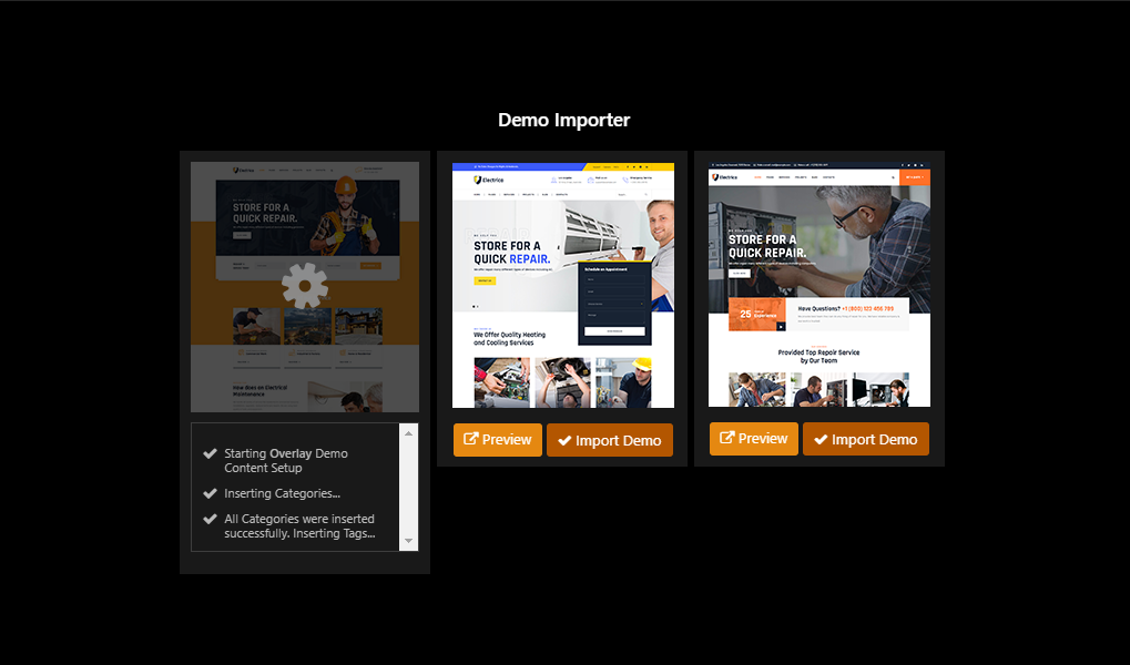 Now you can see Demo Importer box. You can see three options here. You can setup any demo you want. Just click on Import Demo button given below any of the thumbnail.