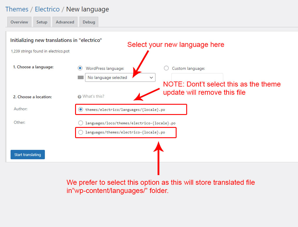 Within this section, you’ll find everything you need to localize and internationalize the Electrico theme into your language. It is split into several subsections to help you easily find what you need. There are different ways for this: