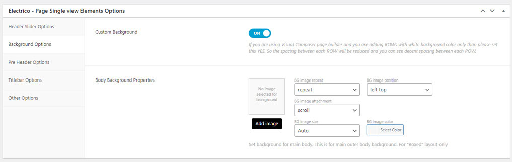 Electrico Options (Theme Options) panel is created with WordPress' Customize section. We added our own options with WordPress' default options.
