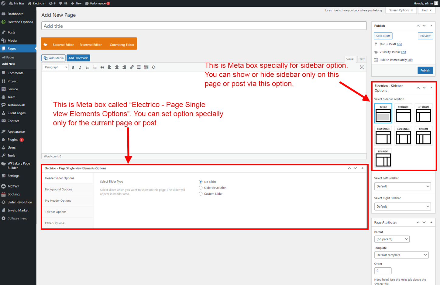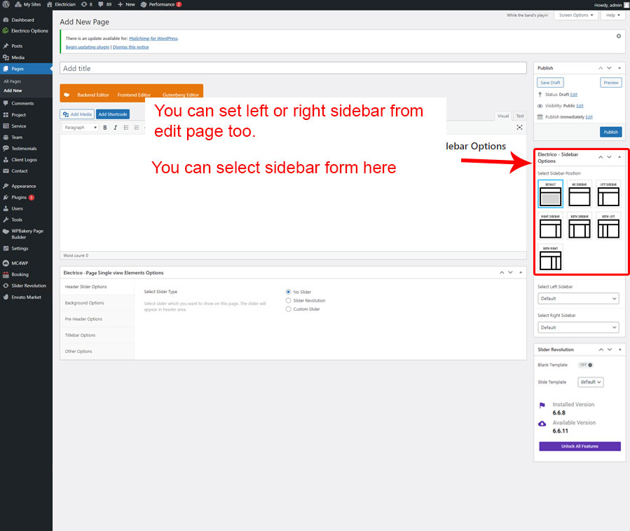 • Left Sidebar For Pages: You can add Widgets that you want to display as Left sidebar for pages that you created using Pages section.