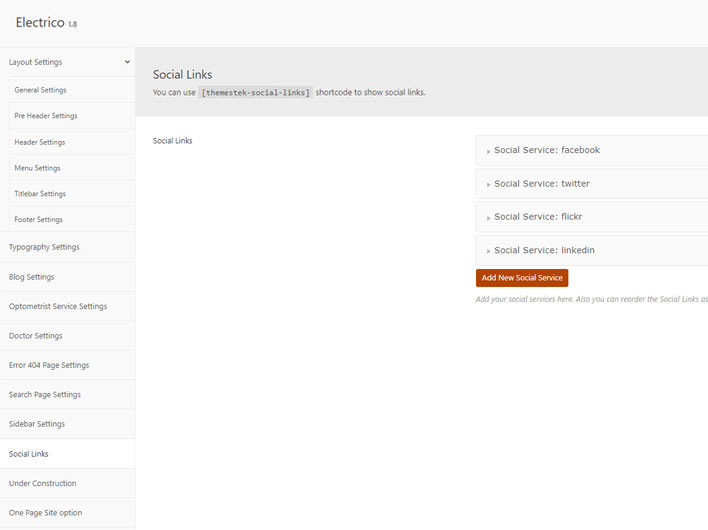 This shortcode specially created to show social links. You can set social links in Electrico Options >> Social Links Section and write your social links. Than it can be shown using [themestek-social-links] shortcode.