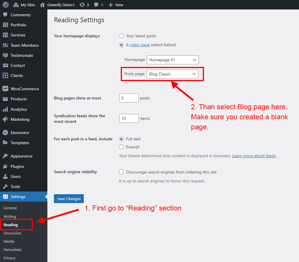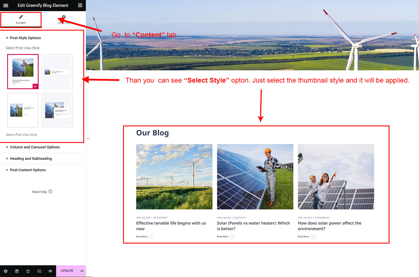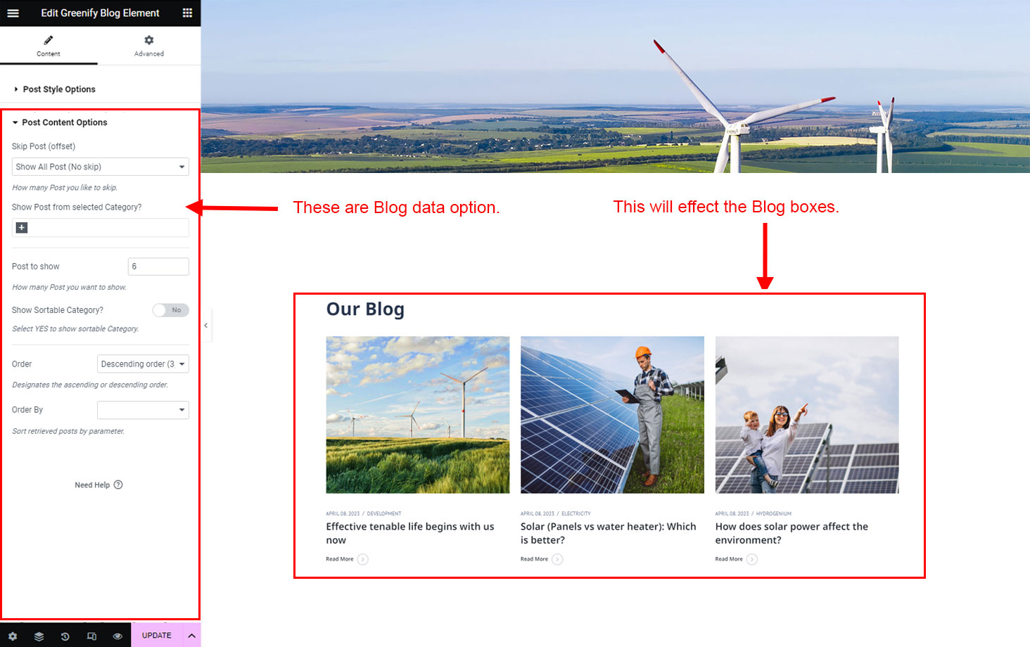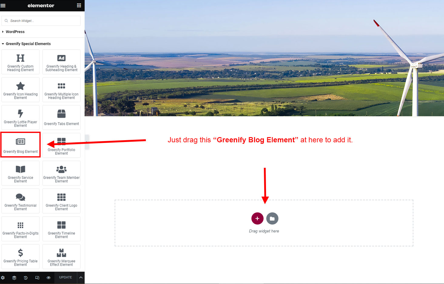 We created a Blog Element in Elementor Page Builder which you can use to show post on any page you want. Just drag and drop the Greenify Blog Element on any page and the post list will appear.