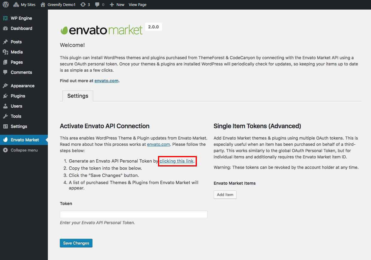 To get started click on the "Envato Market" link in your dashboard menu. You should see a screen similar to the one below. The very first step is to create an Envato API token. To do this, click on the generate a personal token link (highlighted in red below).
