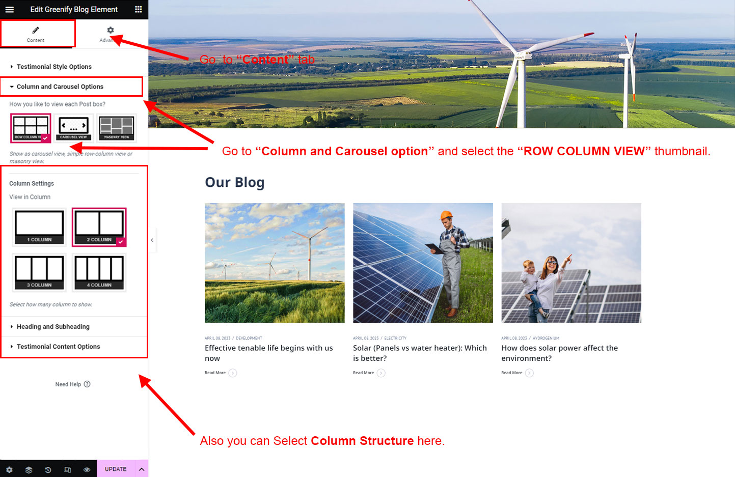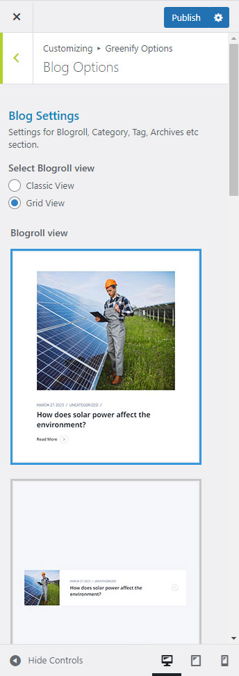 But you can change the view easily. Just go to Greenify Options >> Blog Options and you will find all options to modify the view. You can convert it to block view, column view, limit the blog intro text etc.