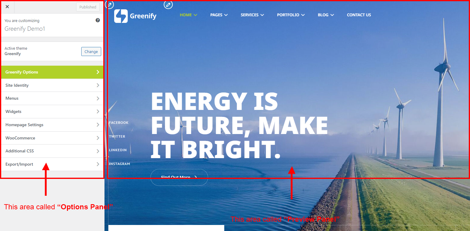 After clicking on the Greenify Options panel you will redirected to the Customize section. It has two sections. Left area called "Options Panel" and the right area called "Preview panel". See screenshot given below: