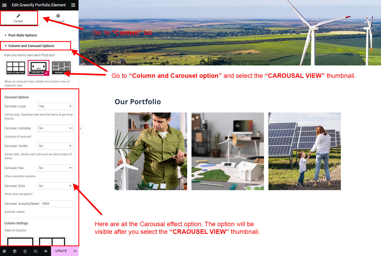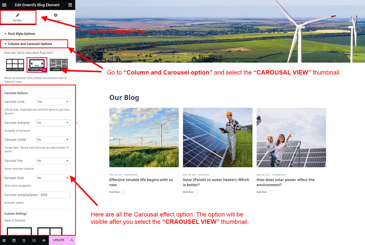 CAROSUEL VIEW: The Carousel view will be animated sliding view. There are lot's of options for the slideing animatins. Like animation speed, animation column, auto-play on or off, Loop post boxes, show/hide the dot or arrow navigation etc.