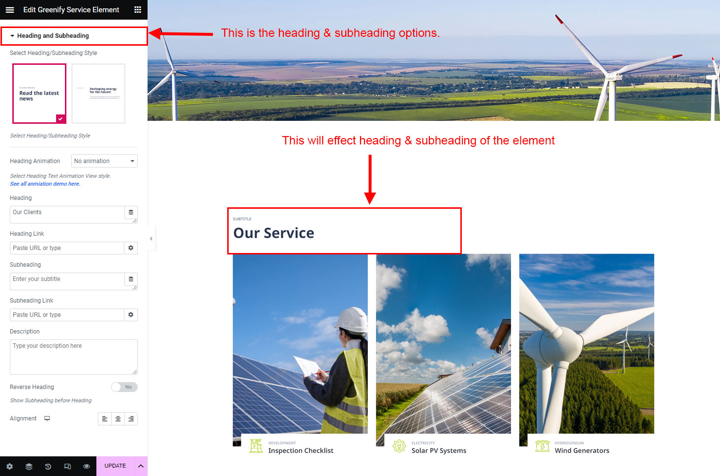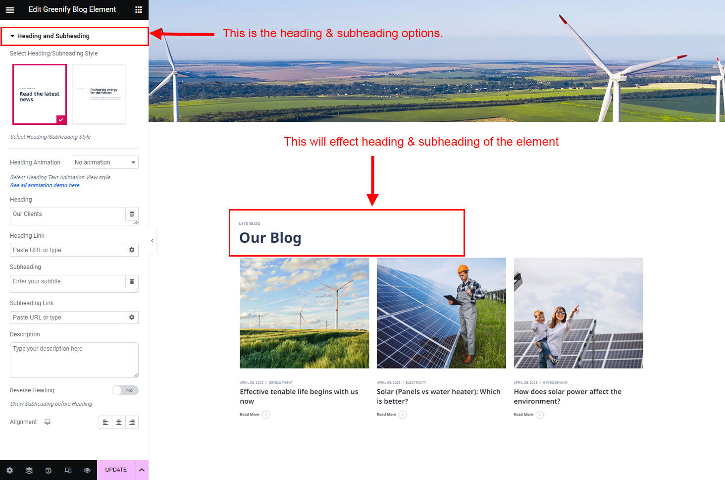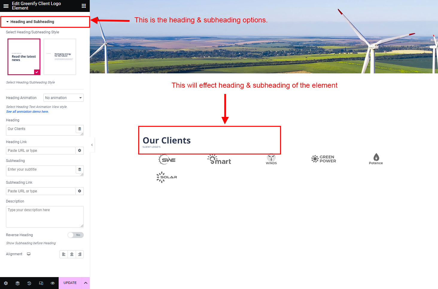 The heading and subheading will appear at top of the element. You can change text, add link to the heading or subheading, change alignment, change tag (for SEO purpose) etc.