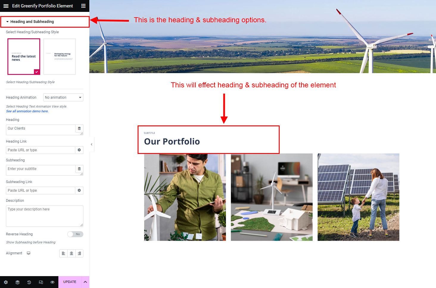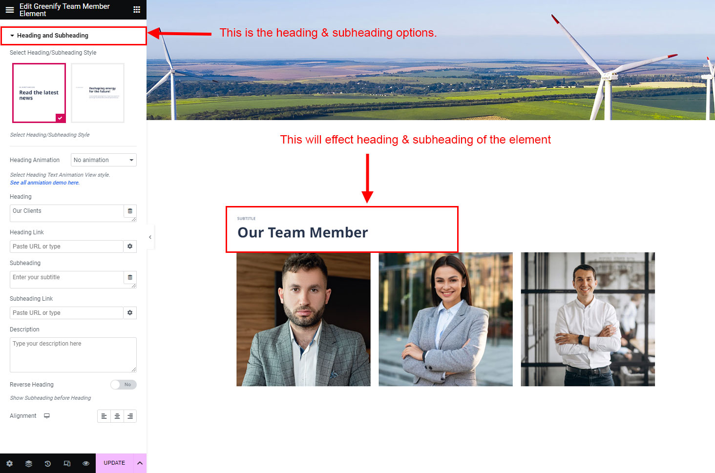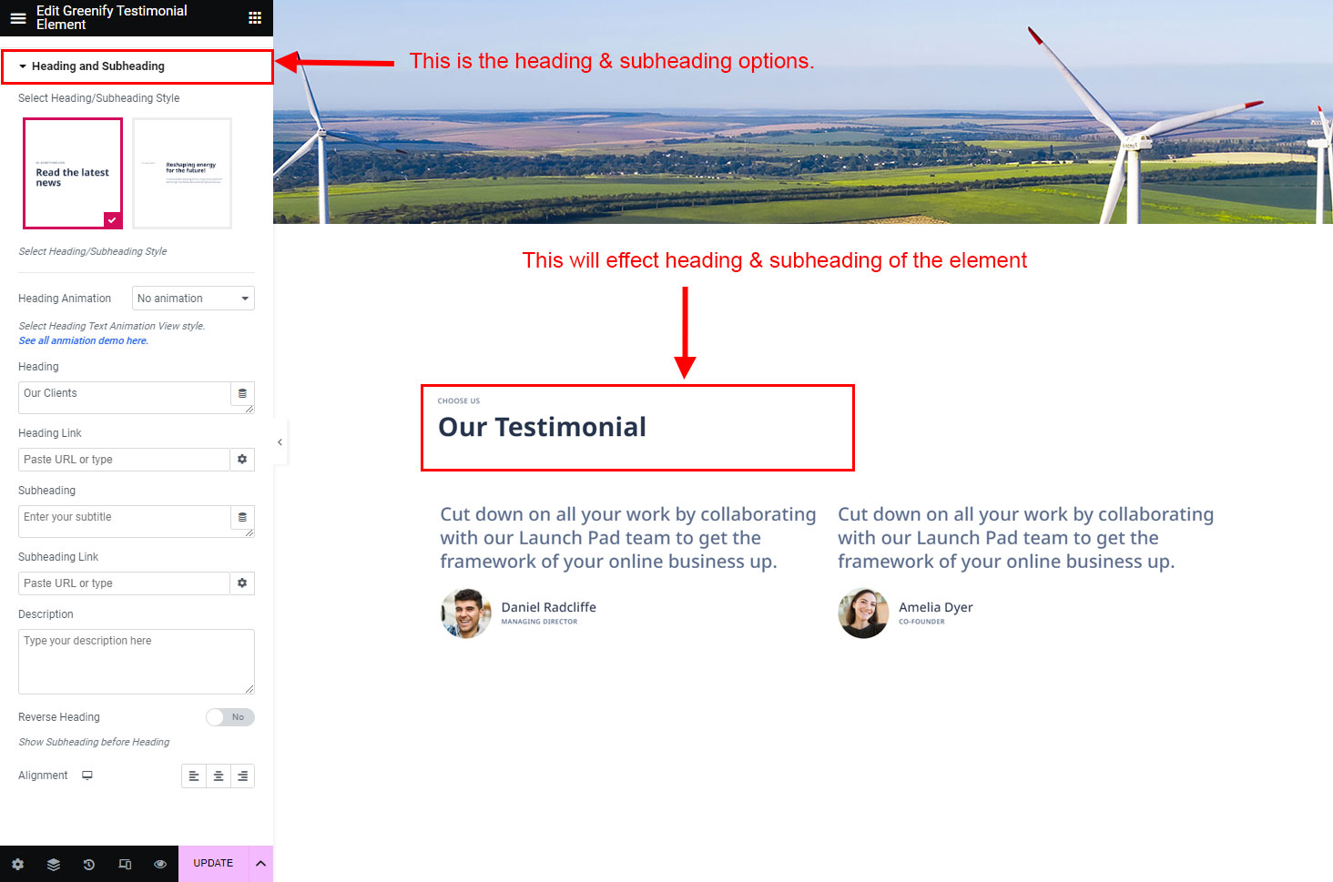 The heading and subheading will appear at top of the element. You can change text, add link to the heading or subheading, change alignment, change tag (for SEO purpose) etc.