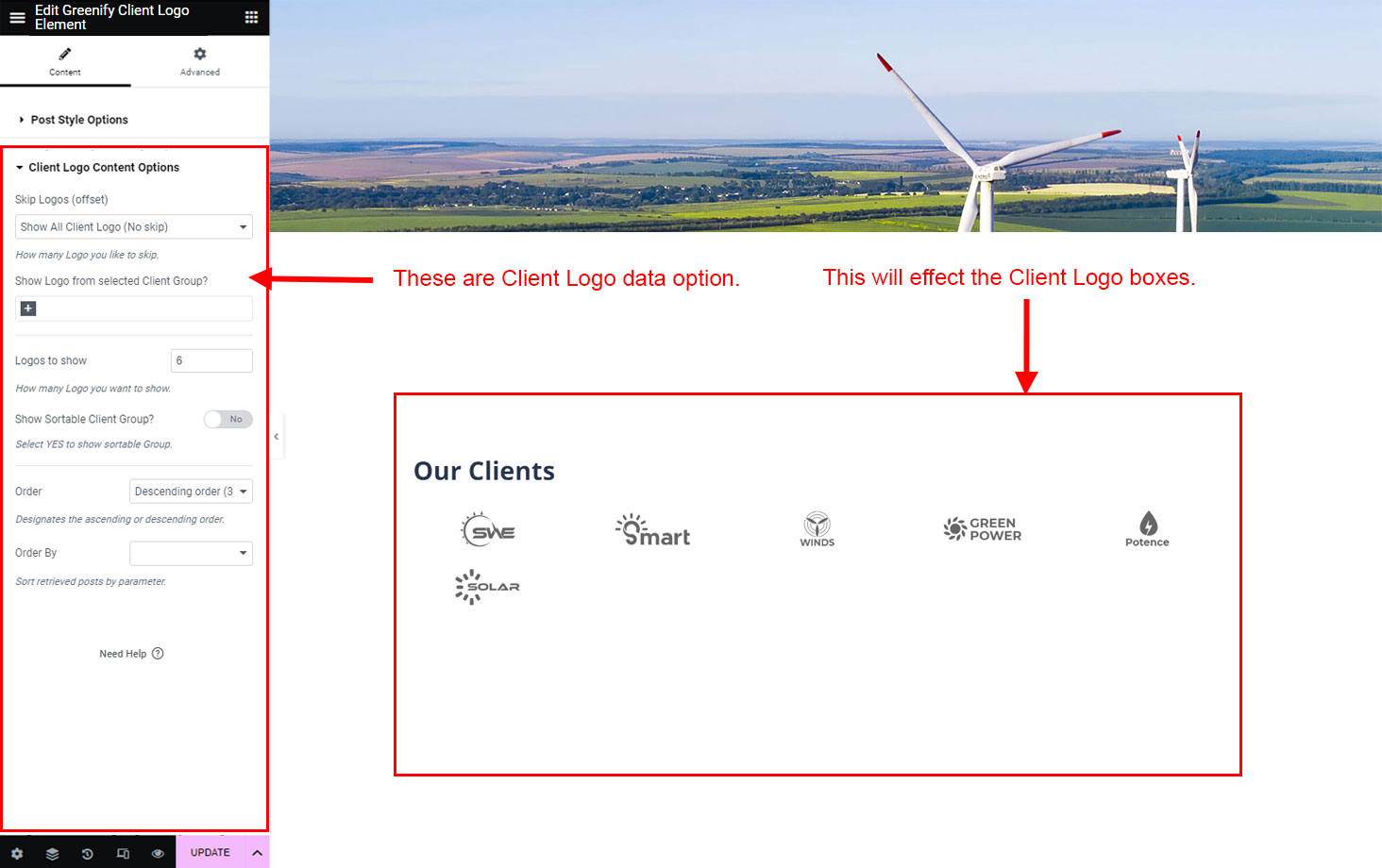You can select the client-logo options here. Like how many client-logo you like to show, show client-logo from selected group (category), client-logo order etc.